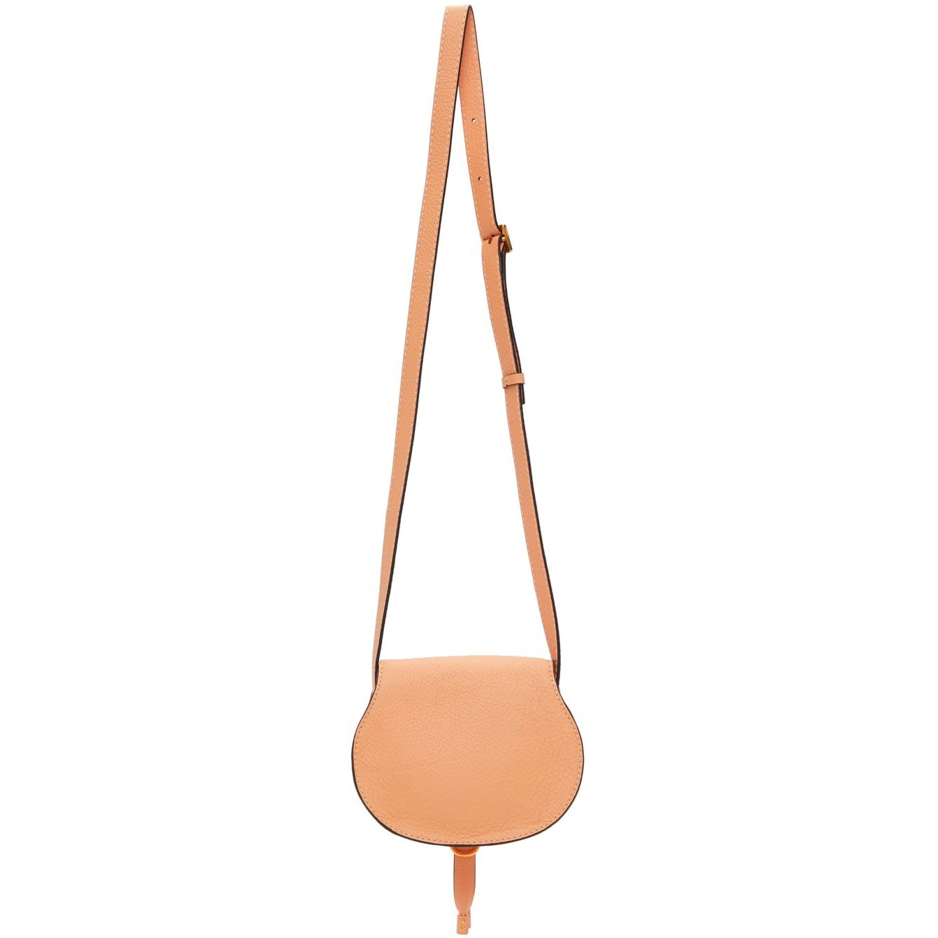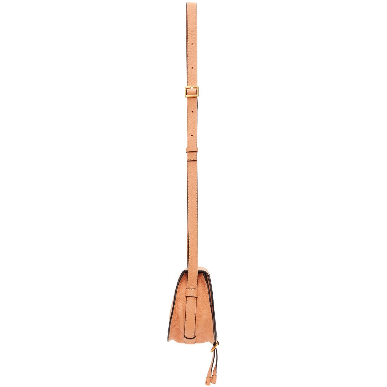 Grained calfskin shoulder bag in pink. Burnished edges in black throughout. Adjustable pin-buckle shoulder strap. Embossed logo, tonal leather appliqués, and concealed patch pocket at face. Foldover flap with tab-slot fastening at main compartment. Patch pocket at interior. Twill lining in khaki. Gold-tone hardware. Approx. 7.5 length x 6.5 height x 4 width. Supplier color: Peach bloom Calfskin. Brand: Chloé