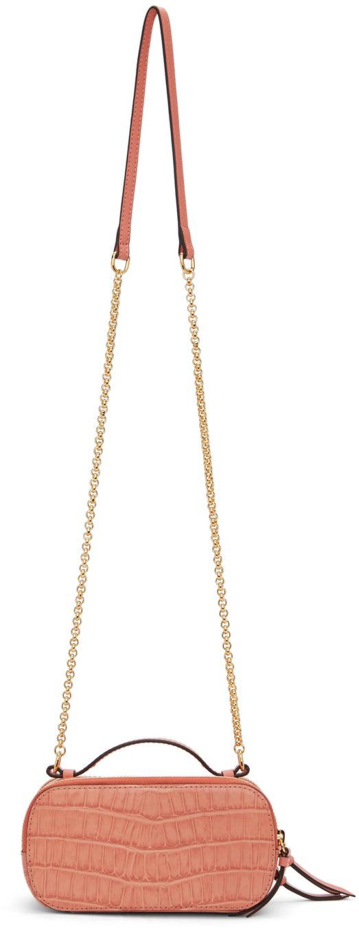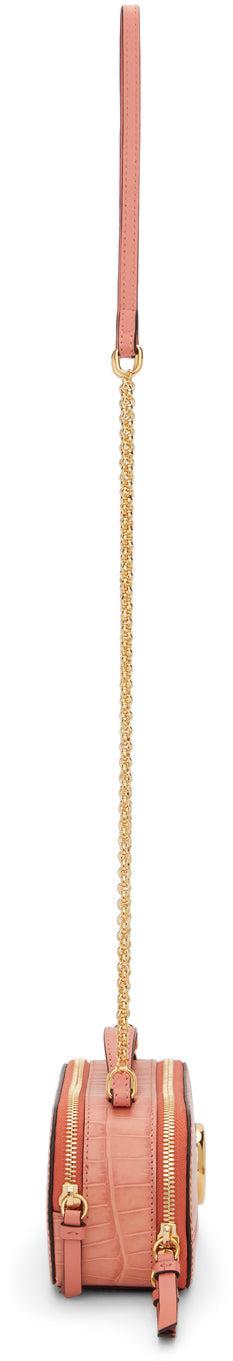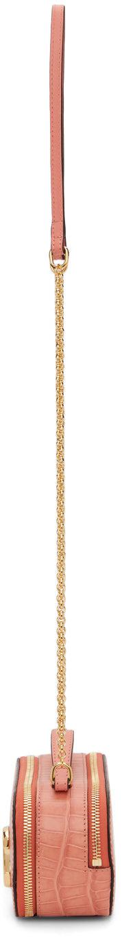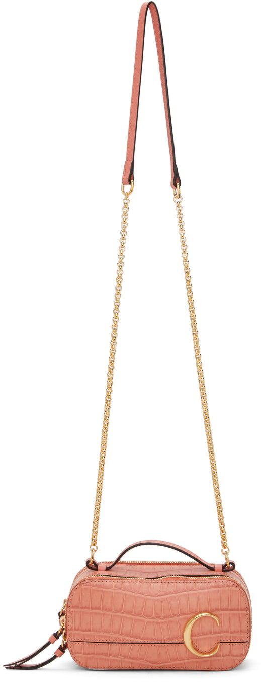 Croc-embossed calfskin shoulder bag in red. Burnished edges in black throughout. Carry handle at top. Curb chain shoulder strap featuring leather strap pad. Logo hardware at face. Twin zippered compartments. Buffed leather cardholder and press-stud coin pouch at interior. Suede lining in beige. Gold-tone hardware. Approx. 7.5 length x 4 height x 3 width. Supplier color: Sunny coral Calfskin. Brand: Chloé