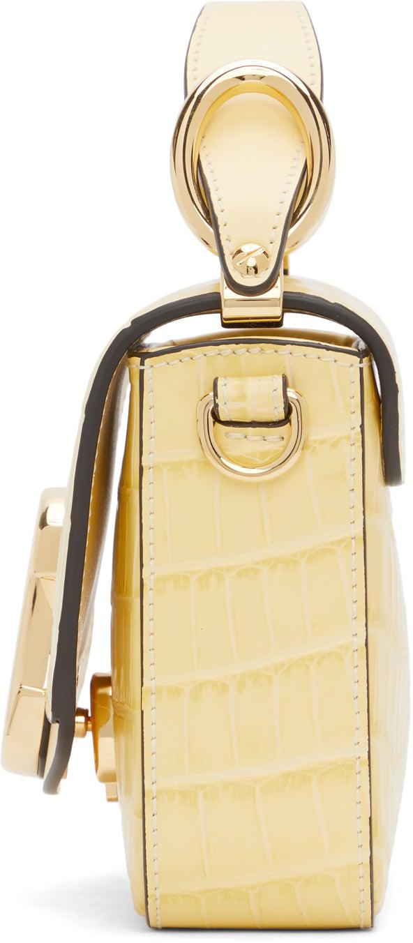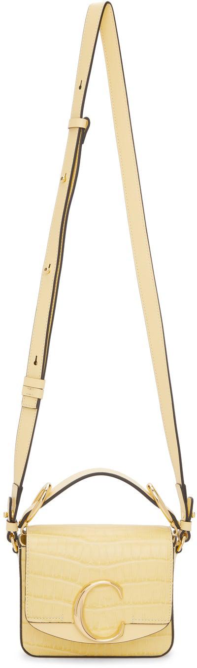 Croc-embossed calfskin shoulder bag in yellow. Burnished edges in black throughout. Logo-embossed carry handle at top. Adjustable and detachable shoulder strap with post-stud fastening. Logo hardware at face. Foldover flap with press-release fastening. Embossed logo and card slot at interior. Cotton twill lining in beige. Gold-tone hardware. Approx. 6.5 length x 5 height x 2 width. Supplier color: Softy yellow Calfskin. Brand: Chloé