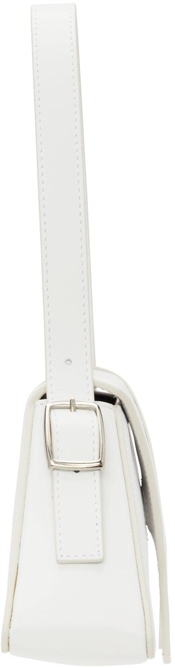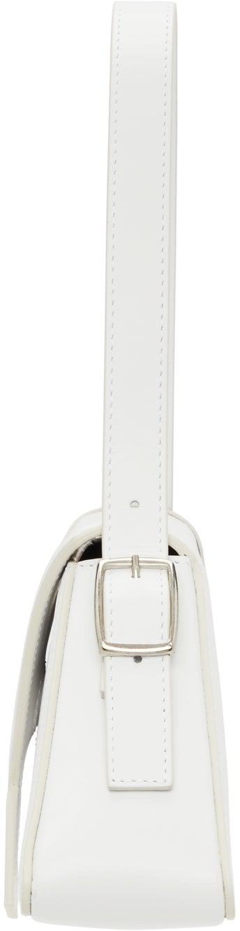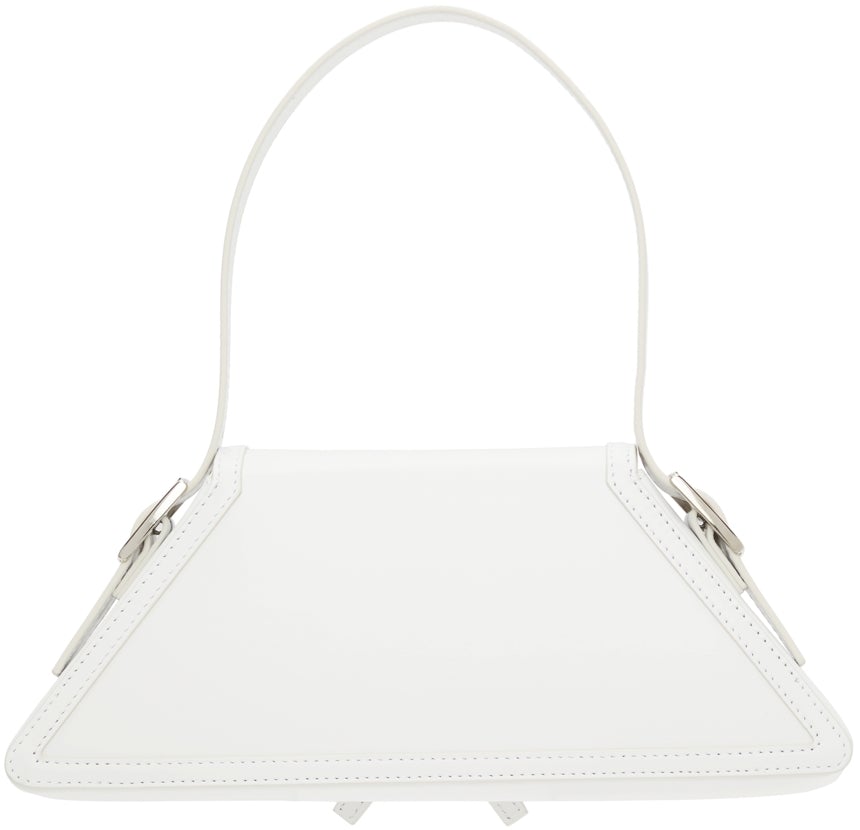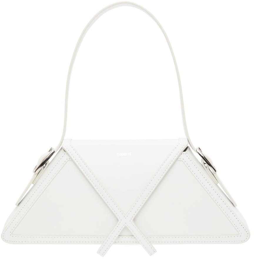 Structured buffed leather top handle bag in white. Adjustable shoulder strap with pin-buckle fastening. Silver-tone logo stamp at face. Foldover flap with magnetic press-stud fastening. Leather lining in black. Silver-tone hardware. Approx. 10.5 length x 4 height x 2.5 width. Supplier color: Optic white Leather. Brand: Coperni