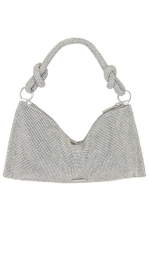 Cult Gaia Hera Nano Shoulder Bag in Metallic Silver. Cult Gaia Hera Nano Shoulder Bag in Metallic Silver. Crystal embellished exterior with faux suede lining and silver-tone hardware. Made in China. Top zipper closure. One main compartment. Metallic faux leather trim. Knotted detail on shoulder strap. Measures approx 10.75W x 6H x 0.25D. Crystal embellished shoulder strap with a 4 drop. CULG-WY101. SH2086MS. Founded in 2012 by designer Jasmin Larian, Cult Gaia is a brand that takes art just as serious as fashion: the timeless collection's pieces are crafted as stunning heirloom items made to live in one's wardrobe forever. As an artistic label that designs for the moving eye, Cult Gaia aims to create an effortless visual feast through its intricately designed accessories, such as handbags, hats and jewelry. Shop the latest in fashion from Cult Gaia