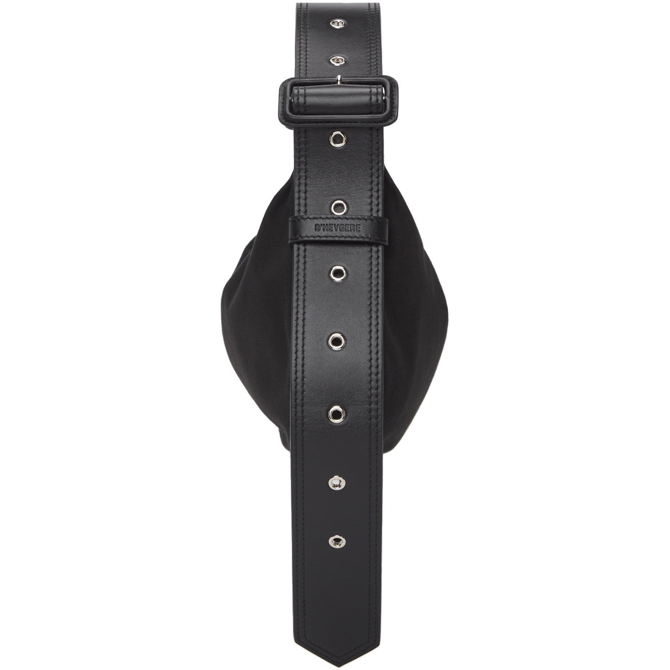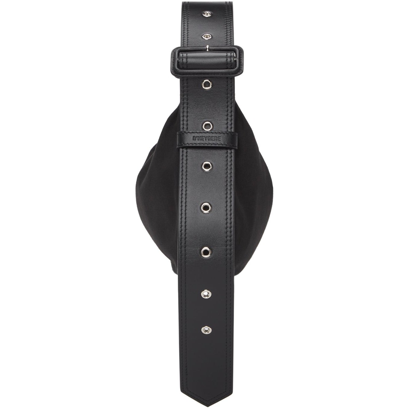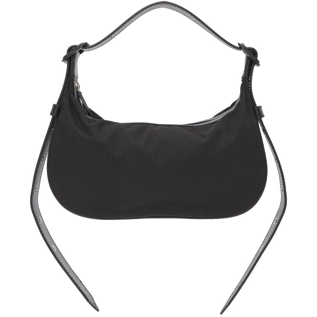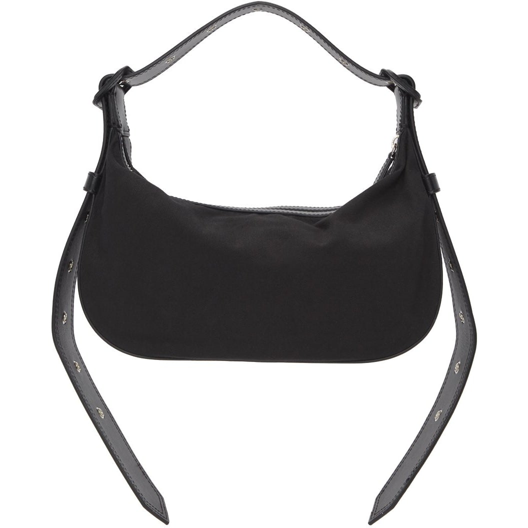 Gabardine shoulder bag in black. Tonal buffed leather trim throughout. Adjustable pin-buckle leather strap. Zip closure. Patch pocket and tonal textile logo patch at interior. Tonal twill lining. Silver-tone hardware. Approx. 11 length x 5.5 height x 2 width. Supplier color: Black Textile. Brand: D'heygere