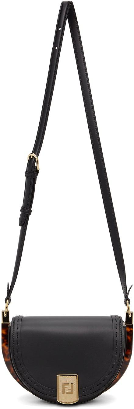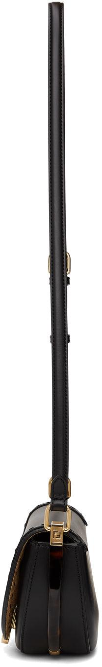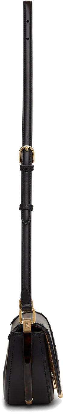 Buffed calfskin shoulder bag in black. Adjustable shoulder strap with pin-buckle fastening. Logo plaque and concealed embossed logo at face. Tortoiseshell plexiglass trim at sides. Foldover flap with magnetic press-stud fastening. Patch pocket and leather logo patch at interior. Suede lining in taupe. Logo-engraved gold-tone hardware. Approx. 7 length x 5 height x 3 width. Supplier color: Black Calfskin. Brand: Fendi