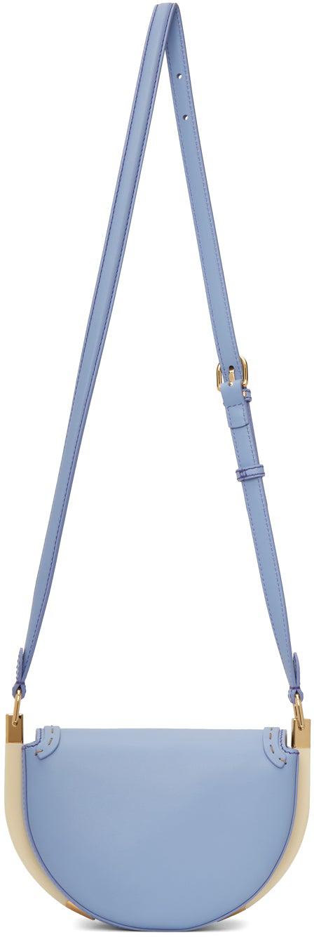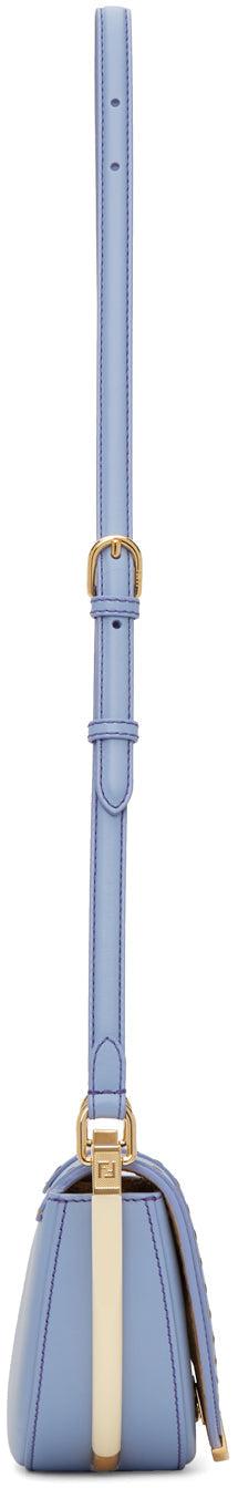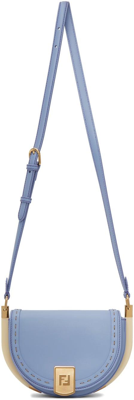Buffed calfskin shoulder bag in blue. Topstitching in beige throughout. Adjustable shoulder strap with pin-buckle fastening. Logo plaque and concealed embossed logo at face. Plexiglass trim in off-white at sides. Foldover flap with magnetic press-stud fastening. Patch pocket and leather logo patch at interior. Suede lining in brown. Logo-engraved gold-tone hardware. Approx. 7 length x 5 height x 3 width. Supplier color: Blue Calfskin. Brand: Fendi