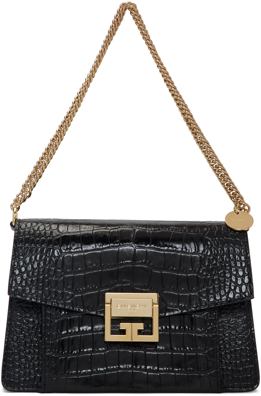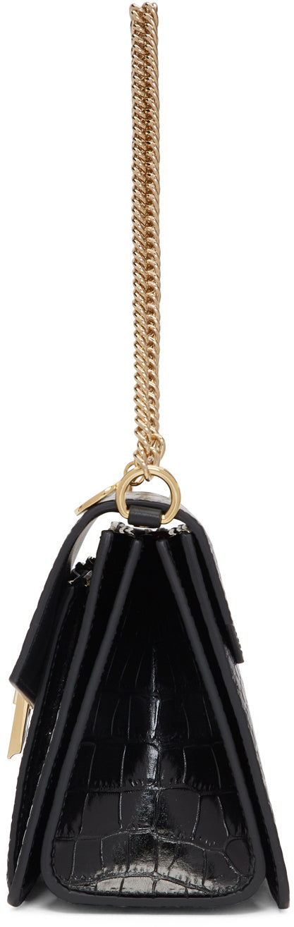 Polished croc-embossed calfskin shoulder bag in black. Curb chain carry handle at top featuring logo disc at handle base. Detachable shoulder strap with lanyard clasp fastening. Foldover flap with logo hardware at flip-clasp fastening. Concealed zippered pocket at face. Two patch pockets at three-compartment interior. Suede interior in grey. Gold-tone hardware. Approx. 9 length x 6 height x 3 width. Supplier color: Black Calfskin. Brand: Givenchy