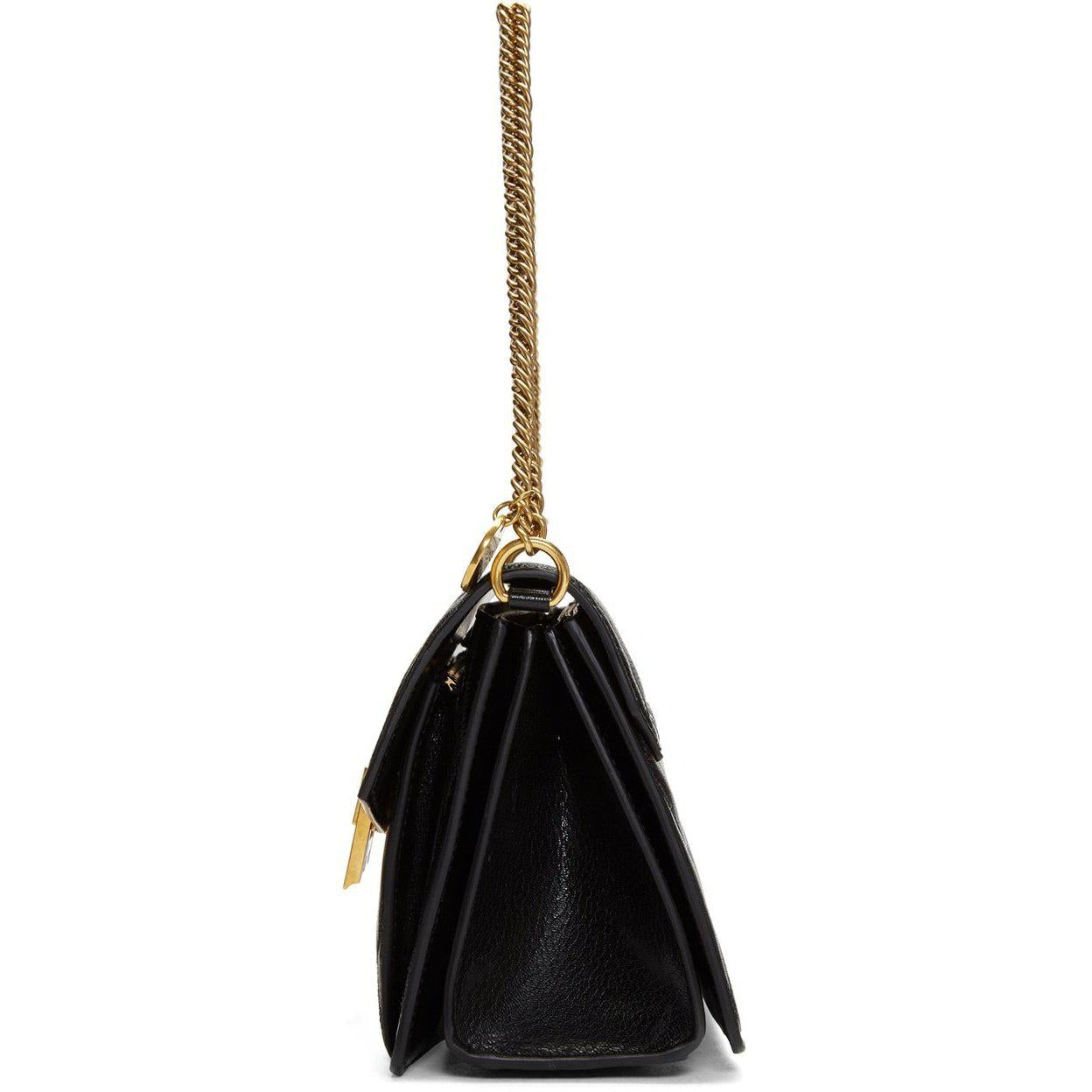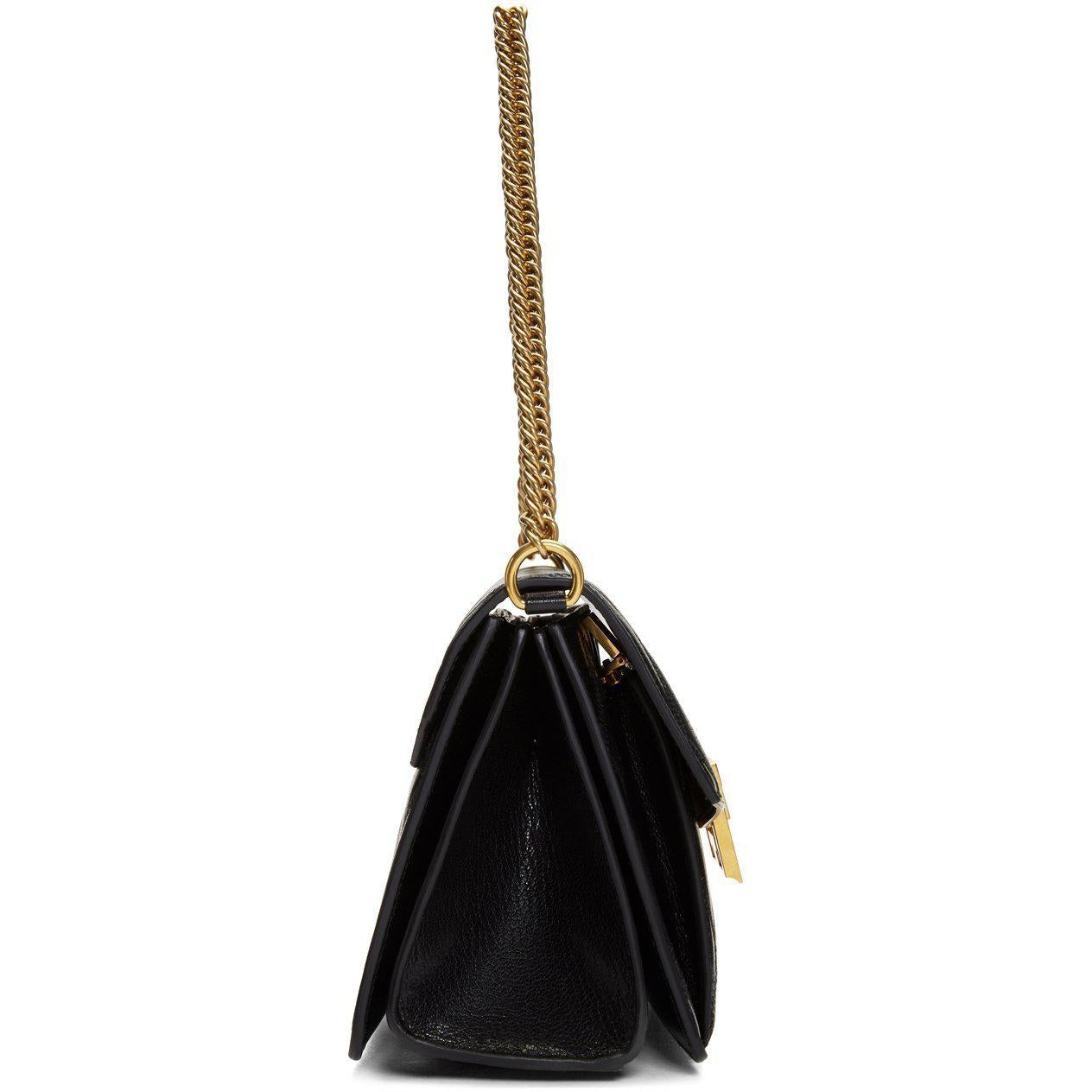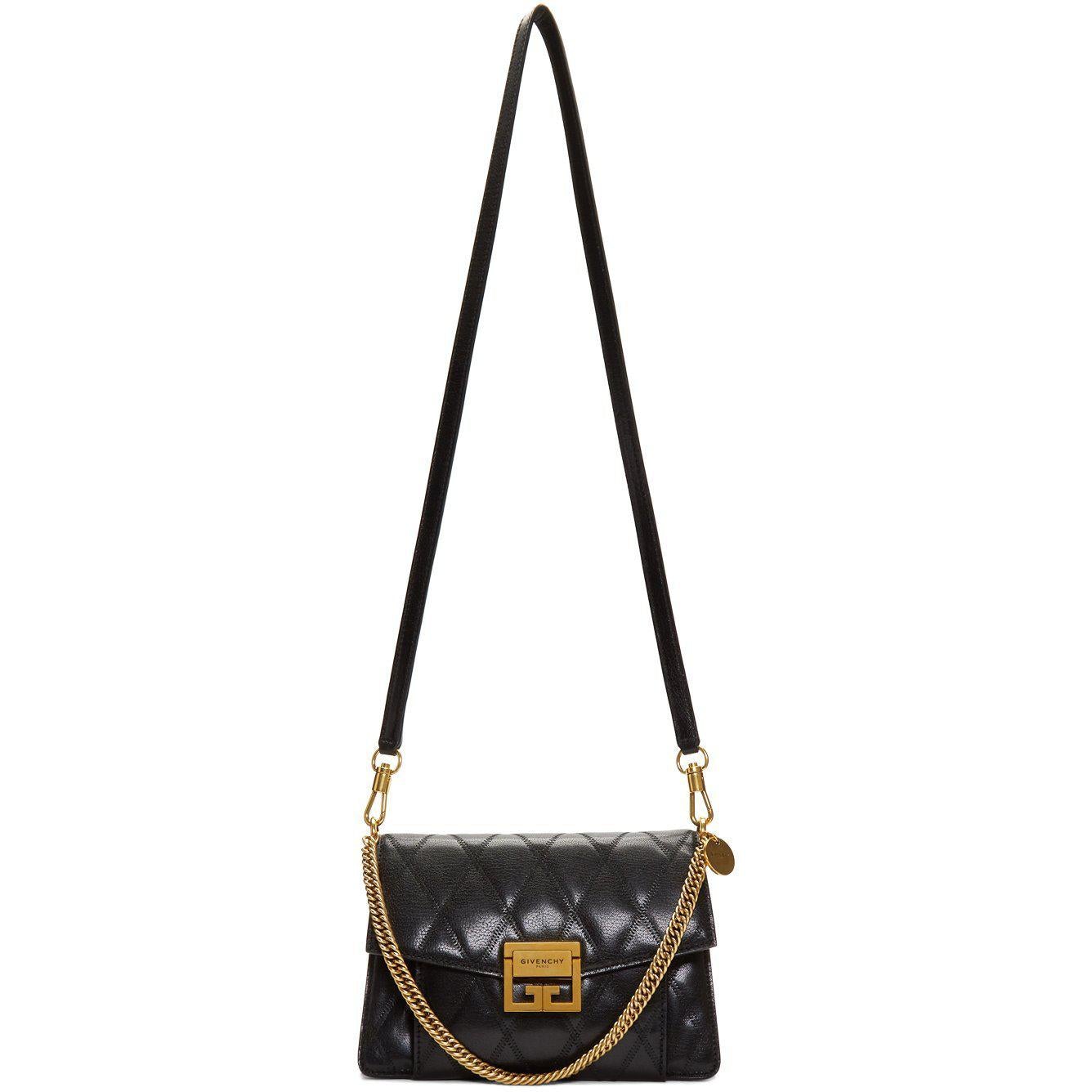 Quilted grained goatskin shoulder bag in black. Curb chain carry handle with logo disc at base. Detachable shoulder strap with lanyard clasp fastening. Logo hardware and concealed zippered pocket at face. Accordion panel at sides. Foldover flap with flip-clasp fastening. Leather logo patch and patch pockets at three-compartment interior. Suede lining in beige and black. Antiqued gold-tone hardware. Approx. 8.5 length x 6 height x 4 width. Supplier color: Black Goatskin. Brand: Givenchy