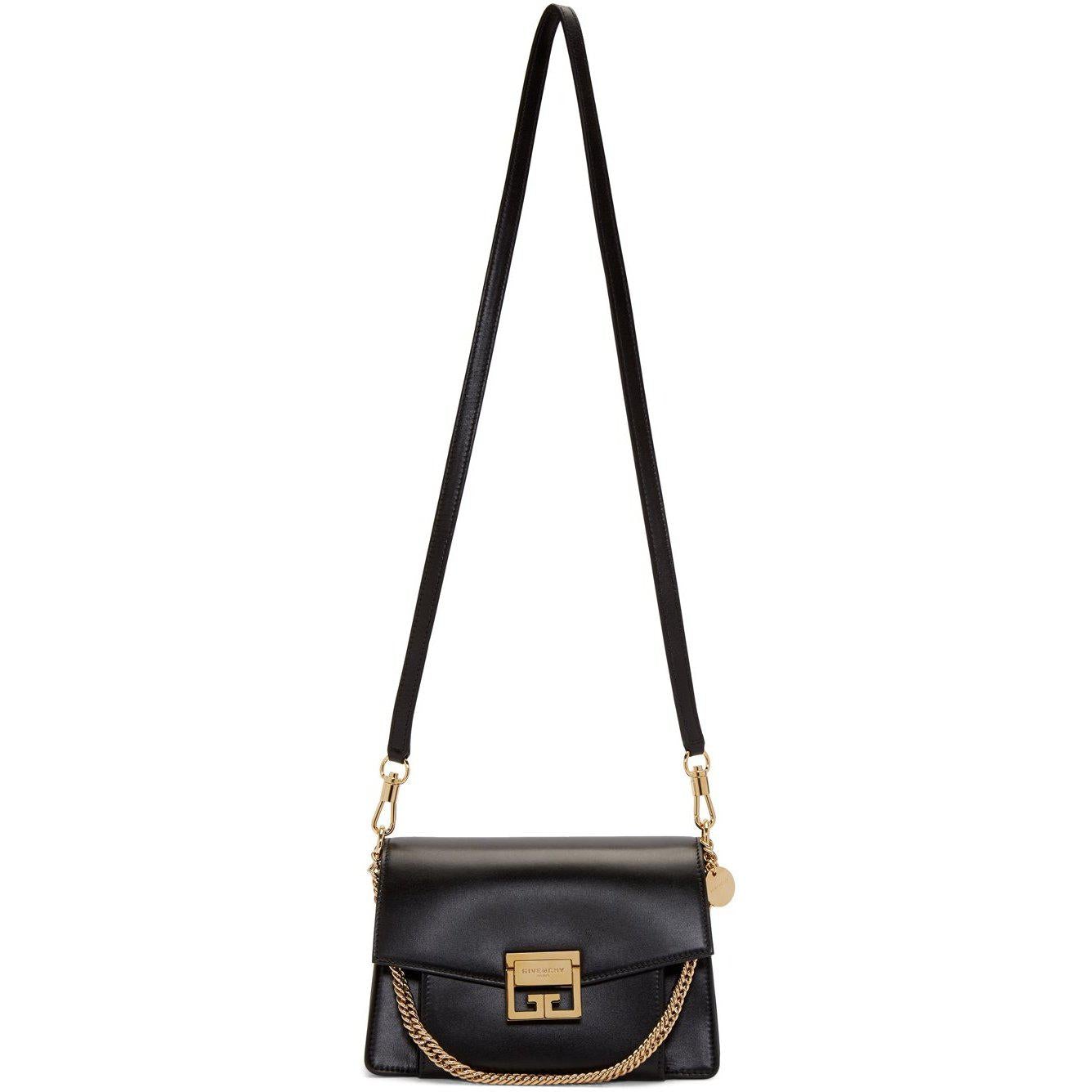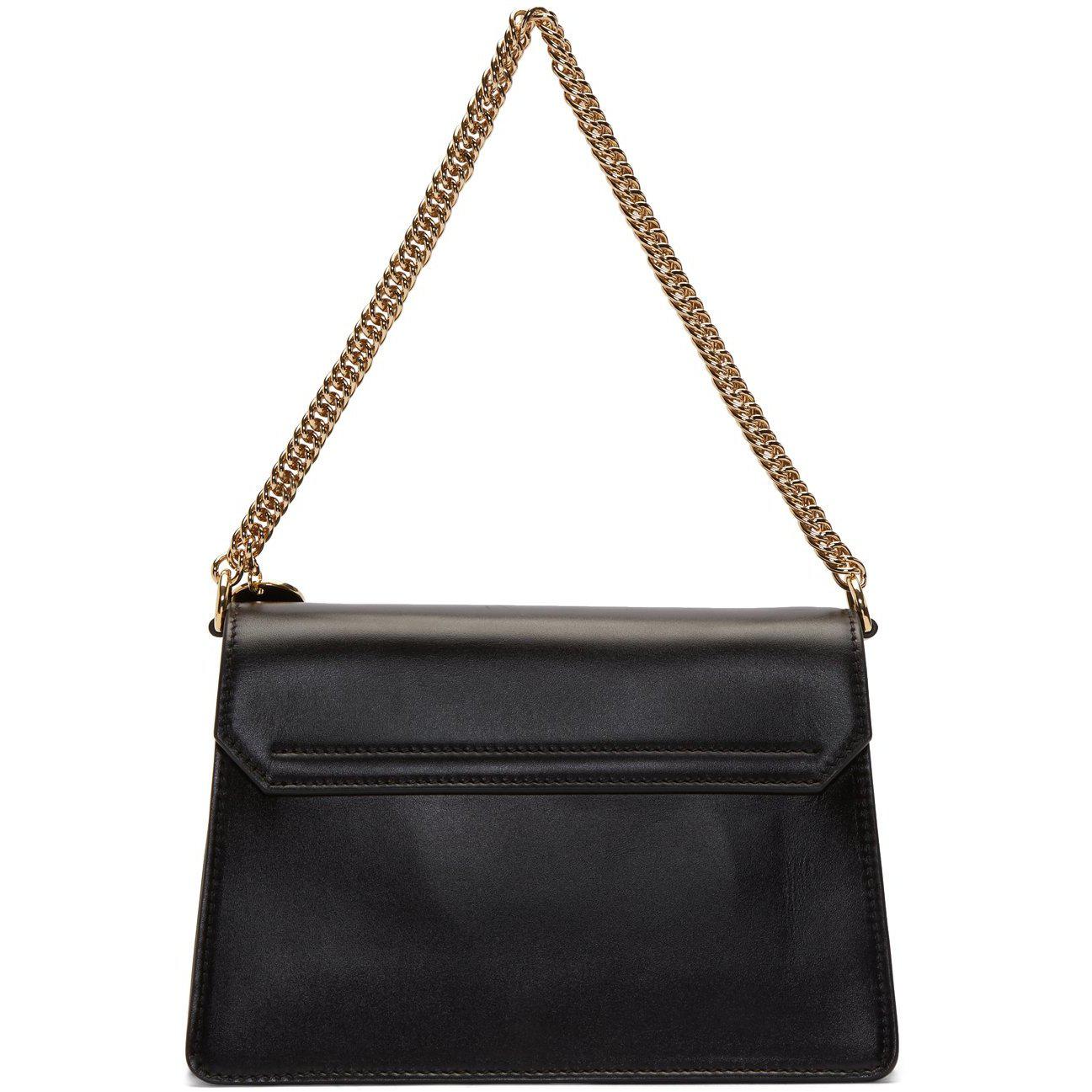 Buffed calfskin shoulder bag in black. Logo disc at curb chain carry handle. Detachable shoulder strap with lanyard clasp fastening. Logo plaque and concealed zippered pocket at face. Accordion panel at sides. Foldover flap with tab-slot fastening at main compartment. Leather logo patch and patch pockets at three-compartment interior. Suede lining in beige. Antiqued gold-tone hardware. Approx. 8.5 length x 6 height x 4 width. Supplier color: Black Calfskin. Brand: Givenchy