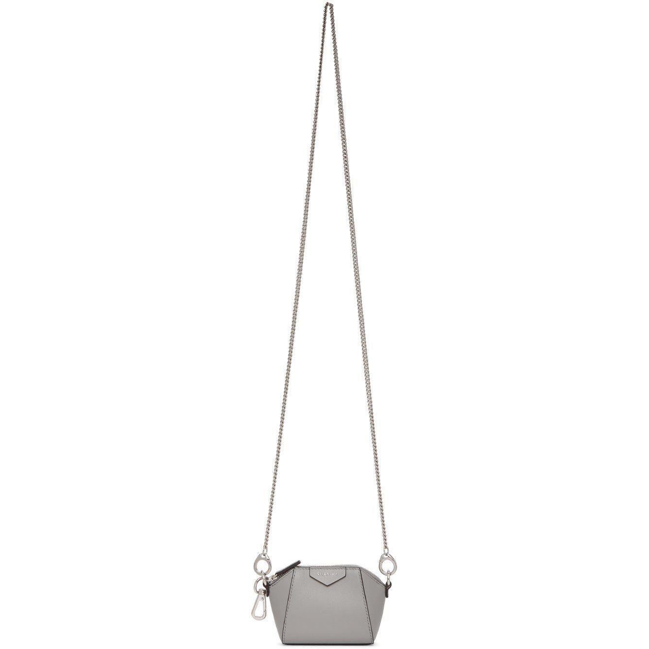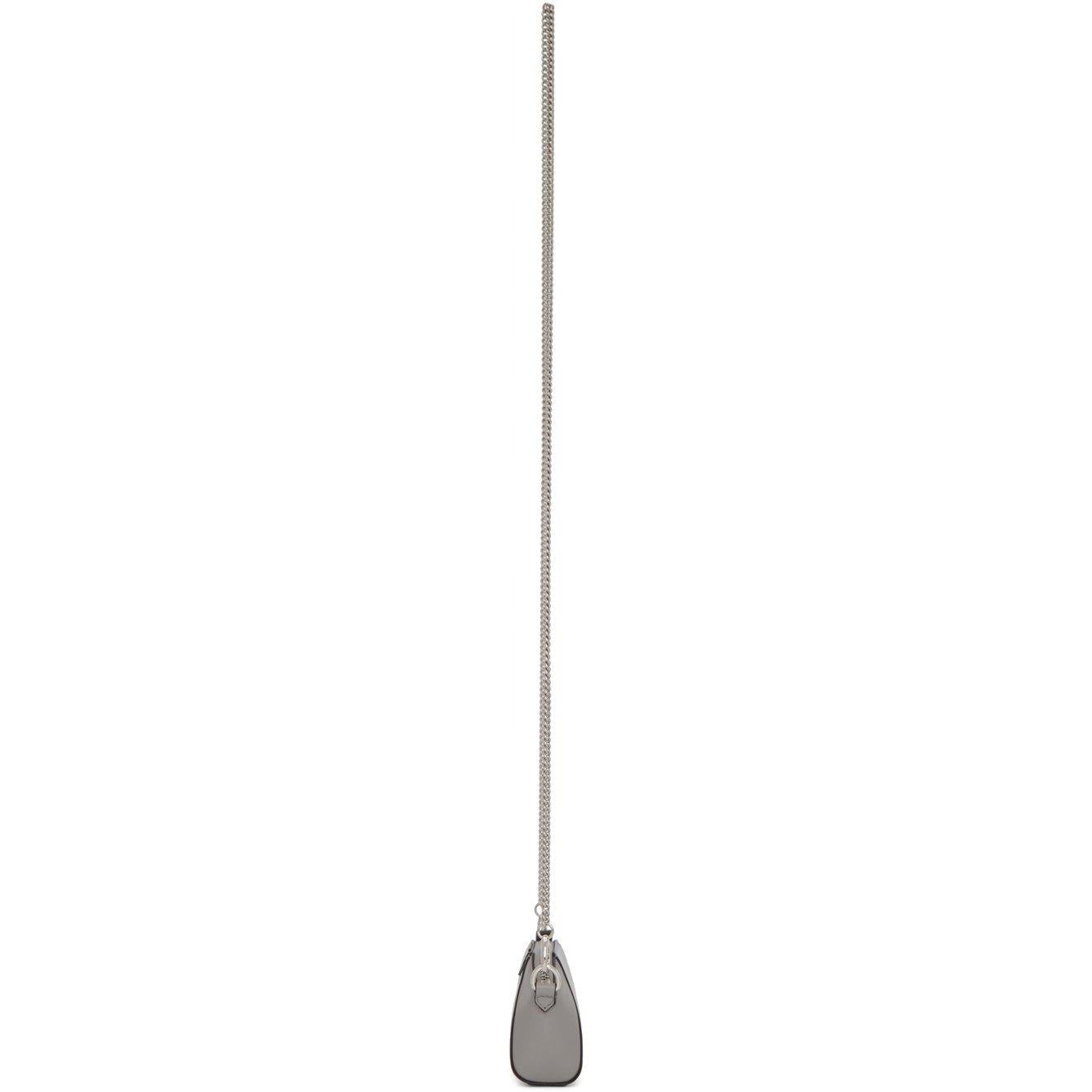 Structured buffed lambskin shoulder bag in grey. Burnished edges in black throughout. Detachable curb chain shoulder strap with lobster clasp fastening. Lanyard clasp at side. Logo stamped leather flag at face. Tonal leather logo patch at interior. Twill lining in khaki. Silver-tone hardware. Approx. 5 length x 3.25 height x 1.5 width. Supplier color: Pearl grey Lambskin. Brand: Givenchy