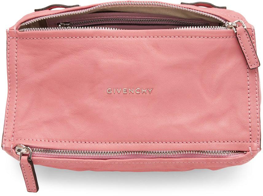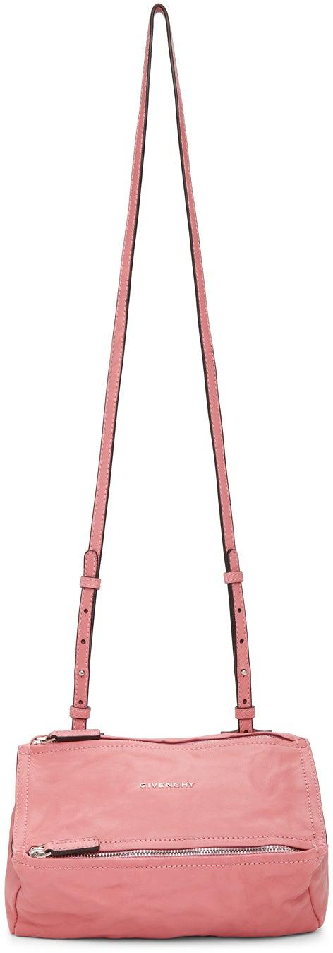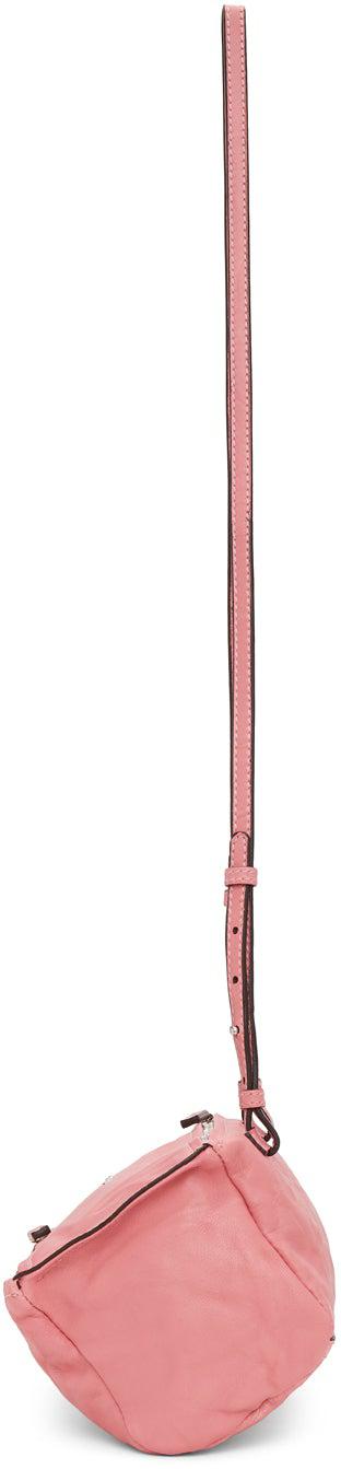 Crinkled sheepskin shoulder bag in pink. Burnished edges in black throughout. Detachable and adjustable shoulder strap with post-stud fastening. Logo hardware and zippered pocket at face. Zip closure at main compartment. Zippered pocket and embossed logo at interior. Textile lining in beige. Silver-tone hardware. Approx. 9 length x 4.5 height x 5 width. Supplier color: Baby pink Sheepskin. Brand: Givenchy