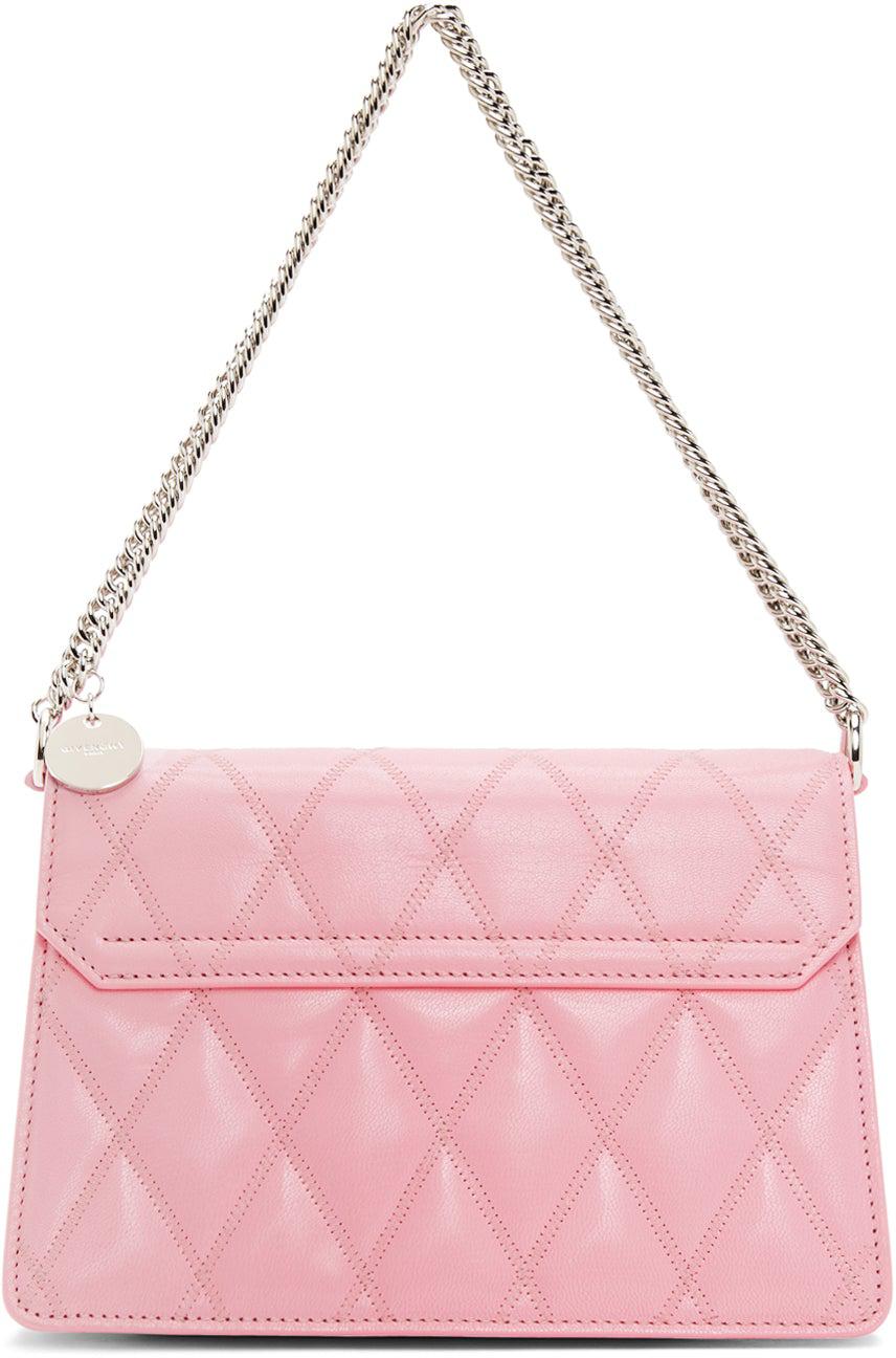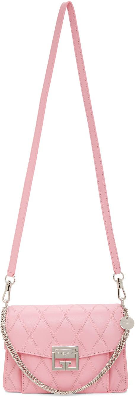 Quilted grained goatskin shoulder bag in pink. Detachable and adjustable shoulder strap with lanyard clasp fastening. Curb chain carry handle with logo disc at top. Logo hardware and concealed zippered compartment at face. Foldover flap with flip-clasp fastening. Two patch pockets and embossed logo at three-compartment interior. Suede lining in beige. Gold-tone hardware. Approx. 8.5 length x 6 height x 4 width. Supplier color: Baby pink Goatskin. Brand: Givenchy
