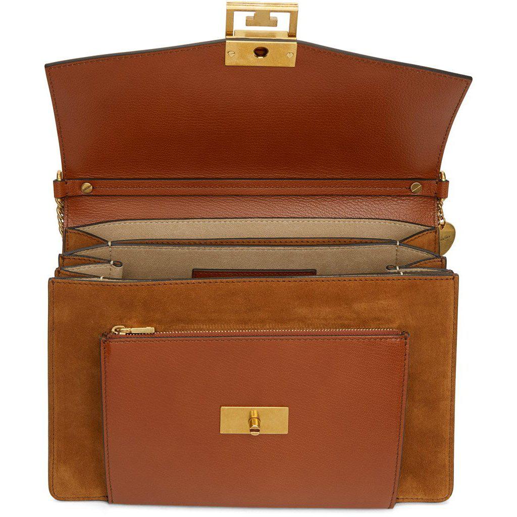 Grained goatskin and suede shoulder bag in tan. Curb chain carry handle with logo disc at base. Detachable shoulder strap with lanyard clasp fastening. Logo plaque and concealed zippered pocket at face. Accordion panel at sides. Foldover flap with tab-slot fastening. Leather logo patch and patch pockets at three-compartment interior. Suede and grained goatskin lining in beige and 'chestnut' tan. Antiqued gold-tone hardware. Approx. 11 length x 7.75 height x 5.25 width. Supplier color: Chestnut Goatskin. Brand: Givenchy