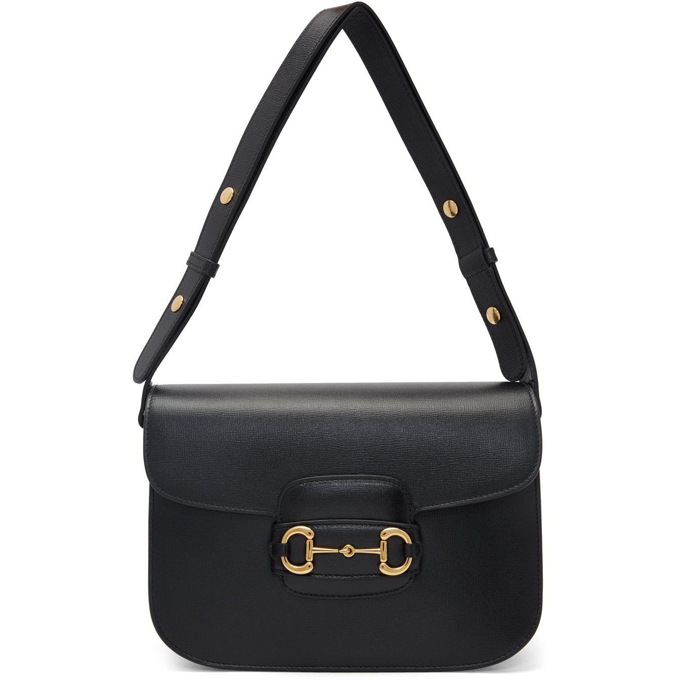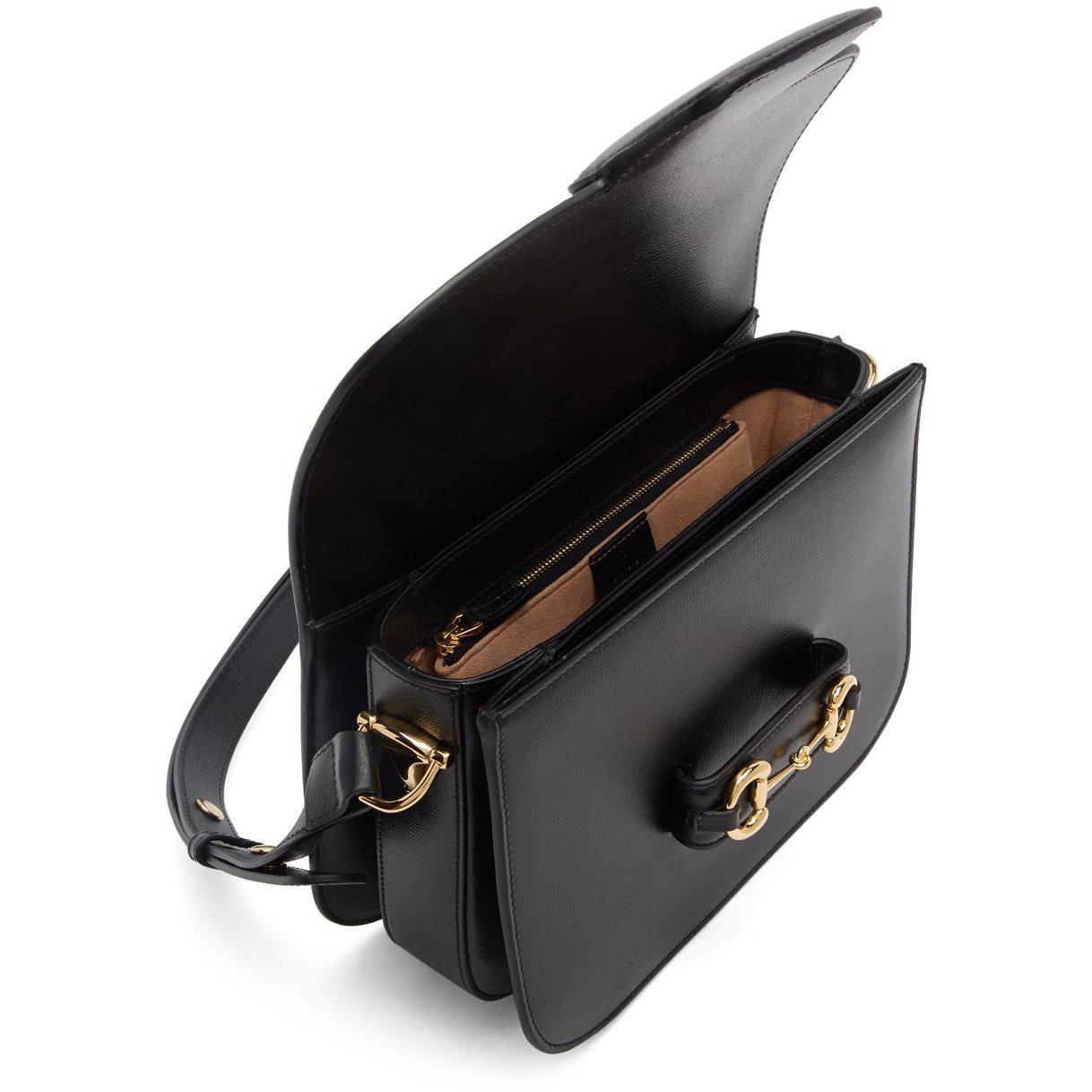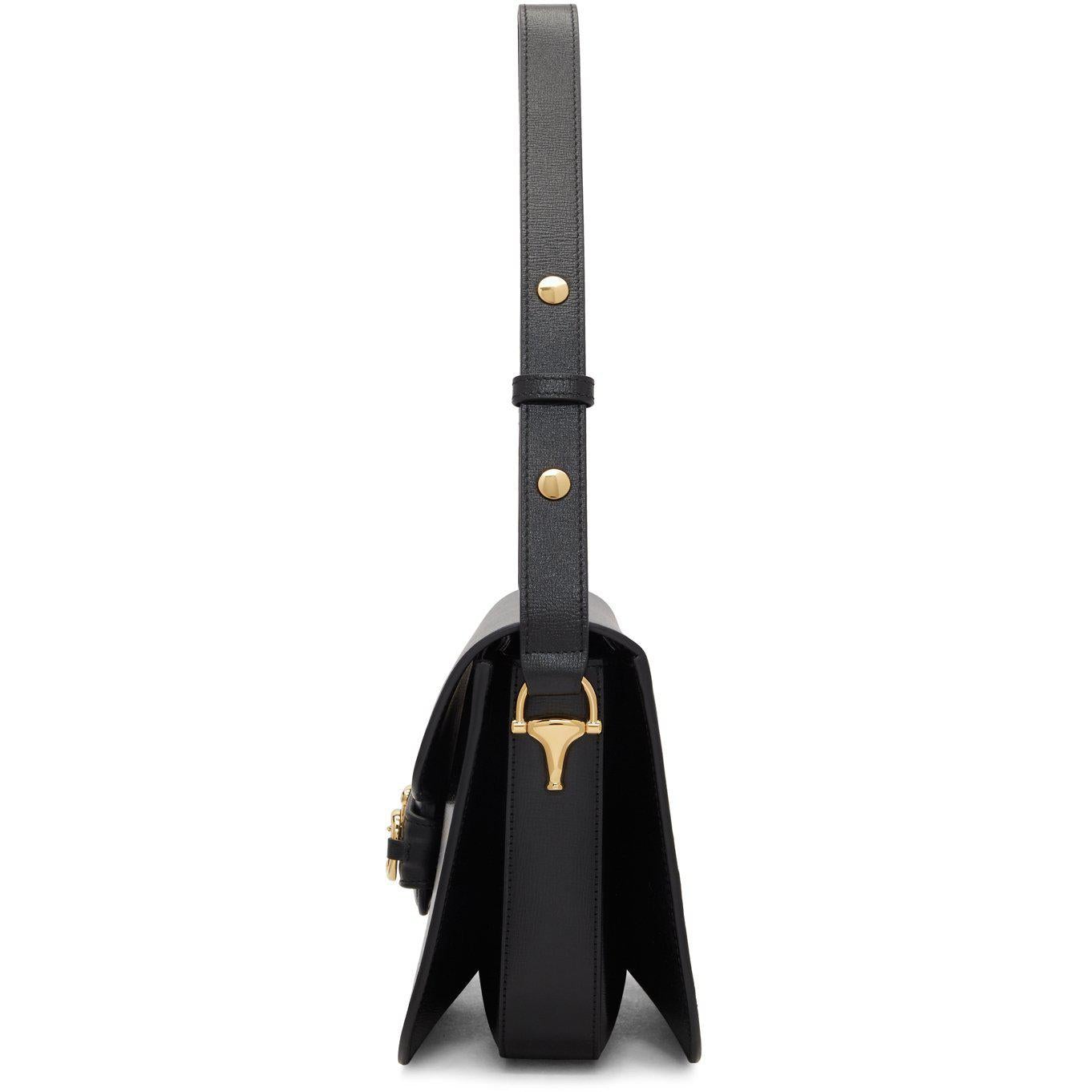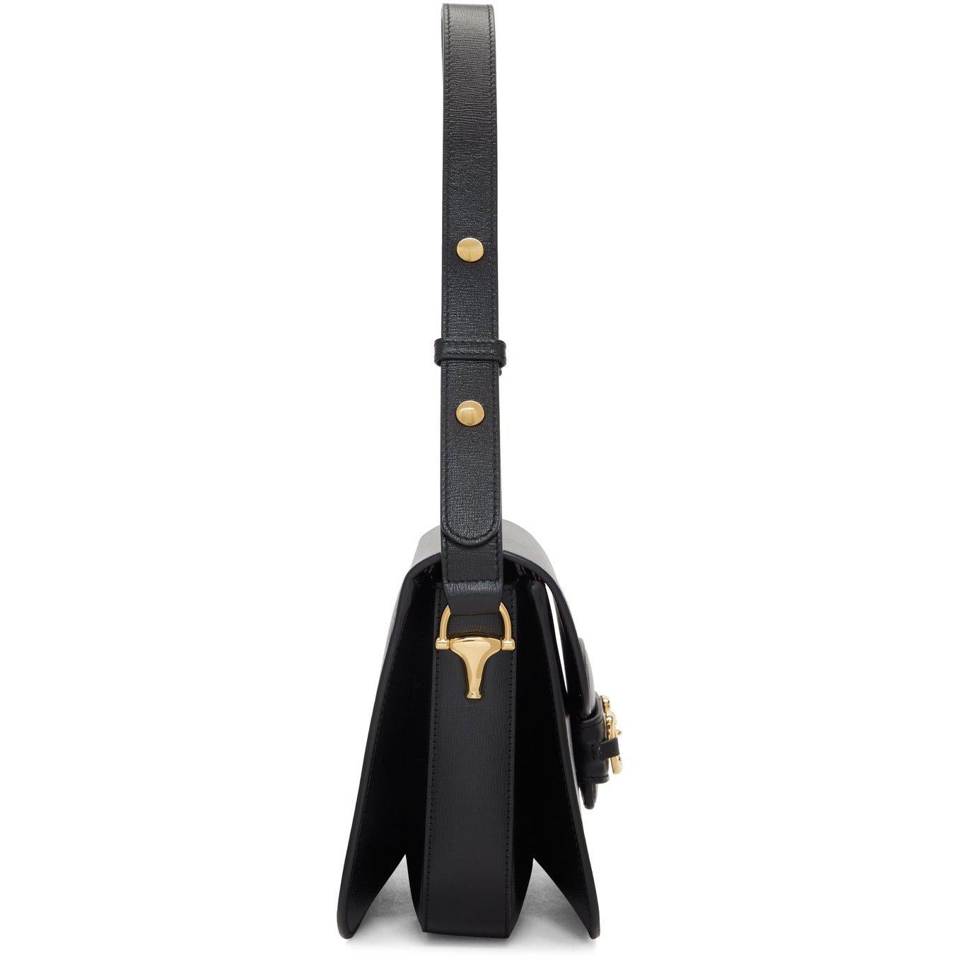 Textured leather shoulder bag in black. Adjustable shoulder strap with press-stud fastening. Horsebit hardware at face. Accordion panel at sides. Foldover flap with tab-slot fastening. Zippered pocket and logo patch at two-compartment interior. Microsuede lining in beige. Gold-tone hardware. Approx. 10 length x 7.5 height x 3 width. Supplier color: Black Leather. Brand: Gucci