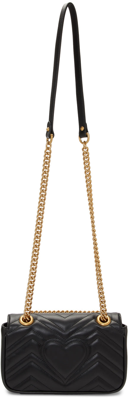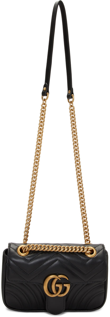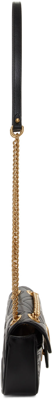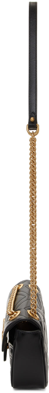 Quilted goatskin shoulder bag in black. Sliding curb chain shoulder strap with leather strap pad. Logo hardware at face. Quilted graphic at back face. Foldover flap with press-stud fastening. Patch pocket and leather logo flag at interior. Beige suede lining. Antiqued gold-tone hardware. Approx. 9 length x 4.5 height x 2.5 width. Supplier color: Black Goatskin. Brand: Gucci