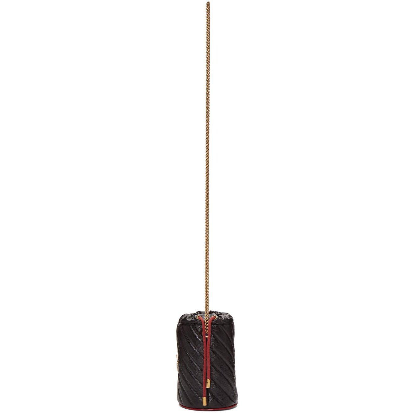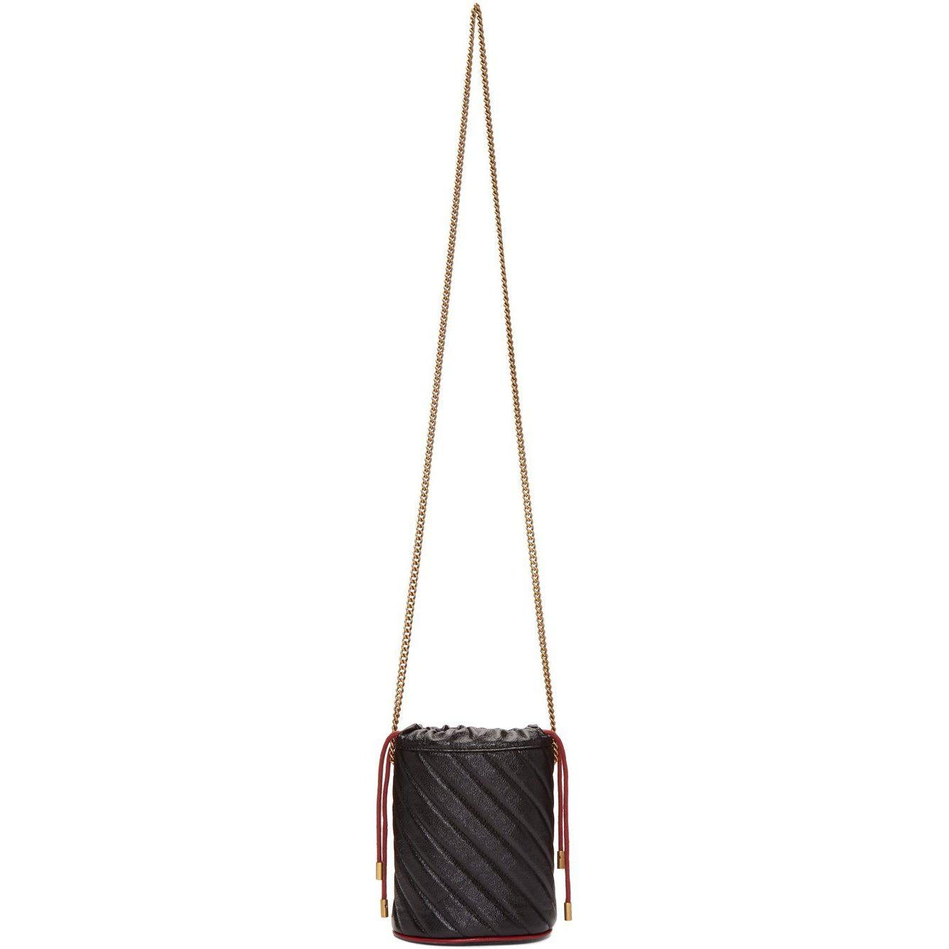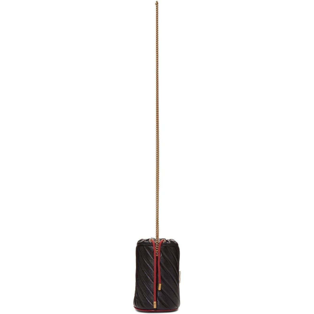 Quilted grained leather bucket bag in black. Burgundy leather binding throughout. Detachable curb chain shoulder strap with toggle fastening. Logo hardware at face. Twin drawstrings in burgundy at throat. Two card slots and logo-engraved keychain with lanyard clasp fastening at interior. Microsuede lining in beige. Antiqued gold-tone hardware. Approx. 5.5 length x 7 height x 4.25 width. Supplier color: Black Leather. Brand: Gucci
