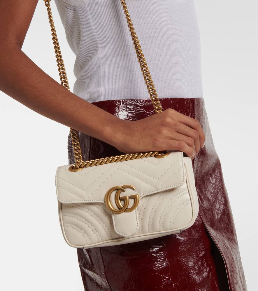 Internal details: internal slot pocket, faux-suede lining. Color of fastening: antique gold. Designer color name: M.White/M.White. Made in Italy. Color of chain strap: antique gold. Comes with dust bag. Chain and leather shoulder strap. Closure: push-lock fastening. Material: calf leather. Shop the latest Gucci Shoulder Bags for women now.