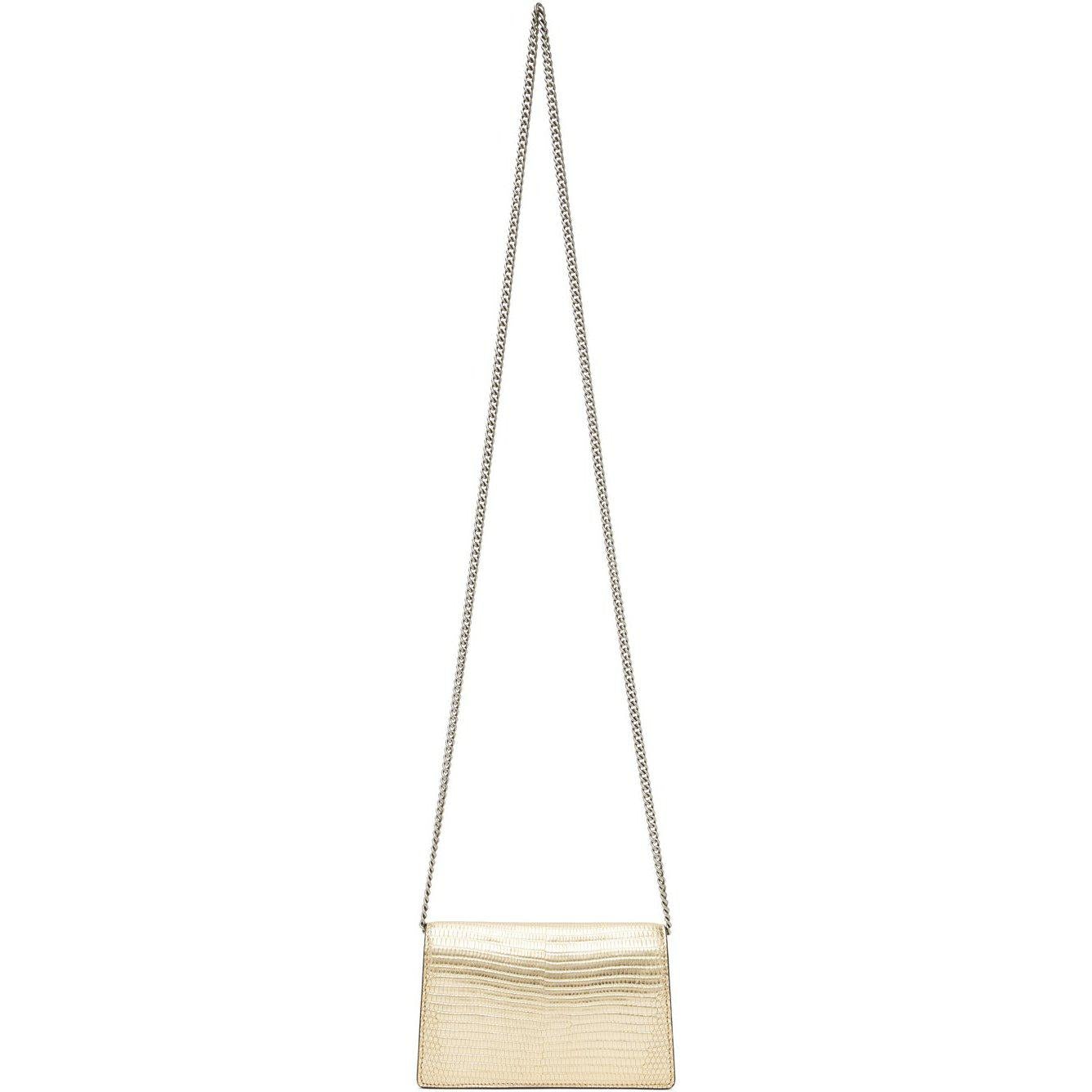 Lizard-embossed calfskin shoulder bag in metallic gold-tone. Burnished edges in black throughout. Detachable curb chain shoulder strap with toggle fastening. Carved graphic hardware at face. Foldover flap with press-stud fastening. Detachable chain link lanyard at interior. Microsuede lining in pink. Antiqued silver-tone hardware. Approx. 6.5 length x 4 height x 1.75 width. Supplier color: Gold Calfskin. Brand: Gucci