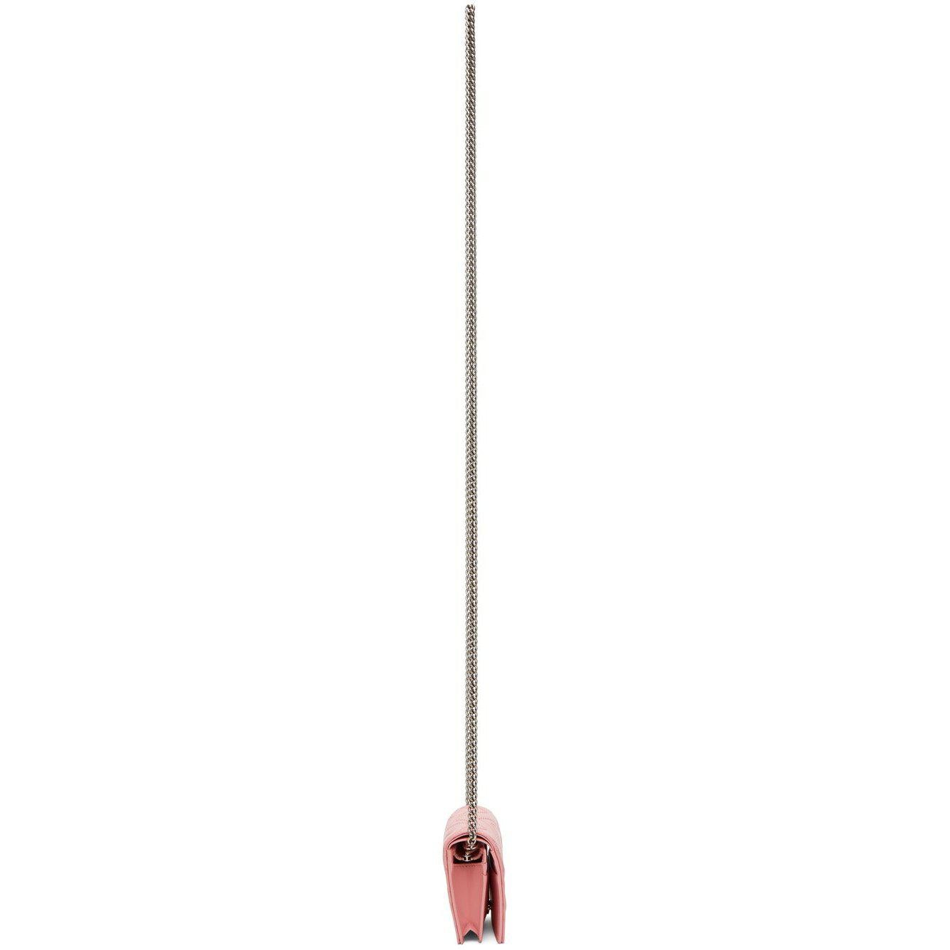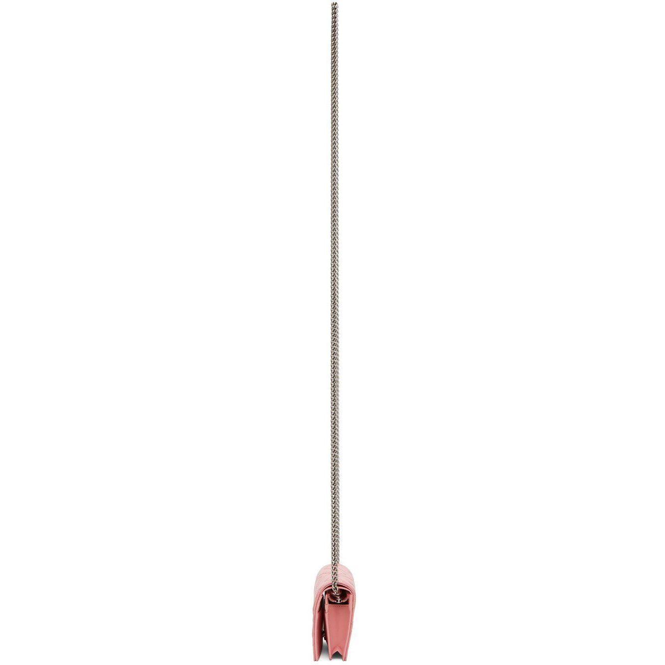 Buffed leather shoulder bag in pink featuring quilted chevron pattern throughout. Detachable curb chain shoulder strap with toggle fastening. Logo hardware at face. Quilted logo at back face. Foldover flap with press-stud fastening. Four card slots, three note slots, zippered pocket and embossed logo at interior. Tonal textile lining. Antiqued silver-tone hardware. Approx. 4.25 length x 3.5 height x 1.5 width. Supplier color: Pink Leather. Brand: Gucci