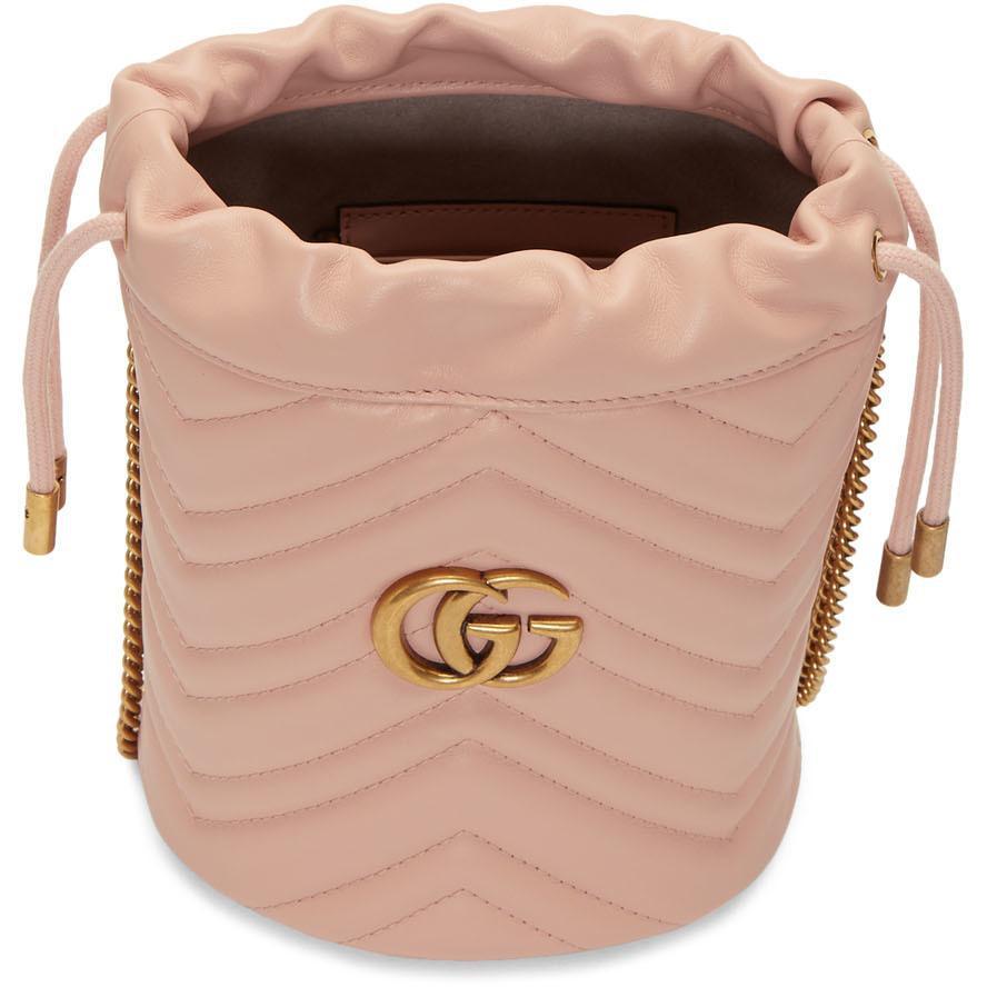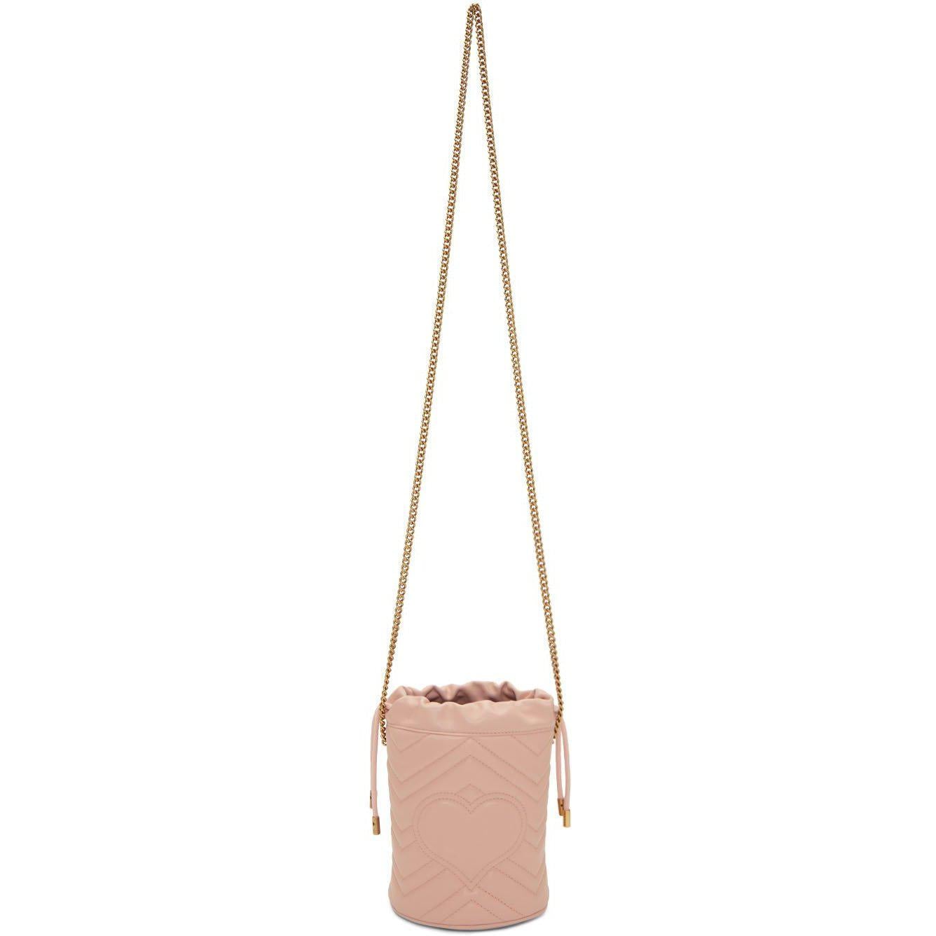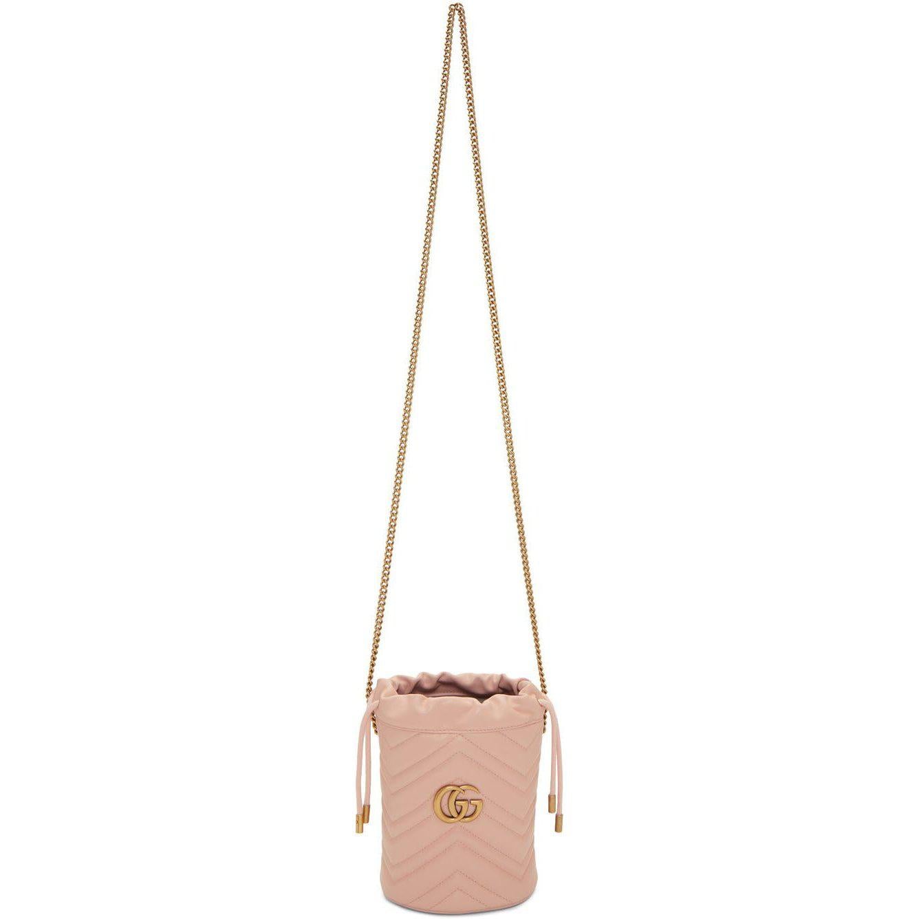 Quilted grained leather shoulder bag in pink. Detachable curb chain shoulder strap with toggle fastening. Logo hardware at face. Graphic topstitched at back face. Drawstring fastening at throat. Two card slots and detachable lobster clasp on curb chain with toggle fastening at interior. Microsuede lining in grey. Gold-tone hardware. Approx. 5 length x 7 height x 4 width. Supplier color: Pink Leather. Brand: Gucci