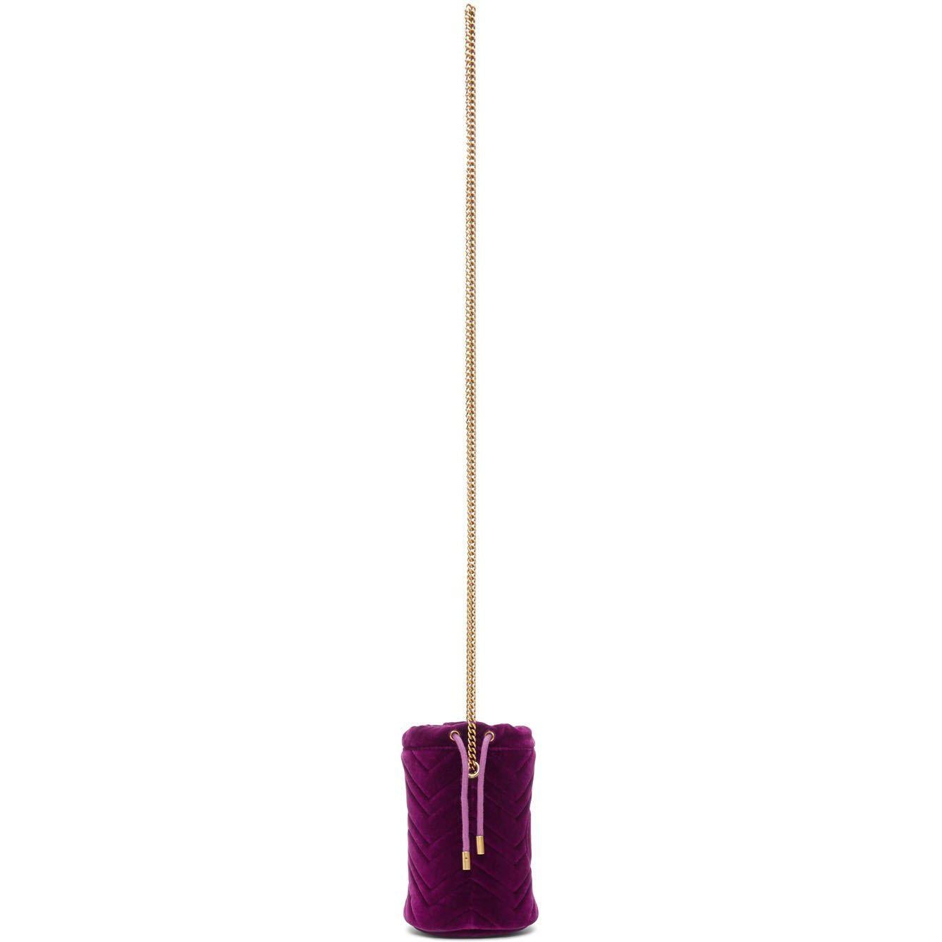 Quilted velvet shoulder bag in pink. Detachable curb chain shoulder strap with toggle fastening. Logo hardware at face. Graphic topstitched at back face. Drawstring fastening at throat. Two card slots and detachable lobster clasp on curb chain with toggle fastening at interior. Tonal silk satin lining. Gold-tone hardware. Approx. 5.5 length x 7 height x 4.25 width. Supplier color: Fuchsia Textile. Brand: Gucci