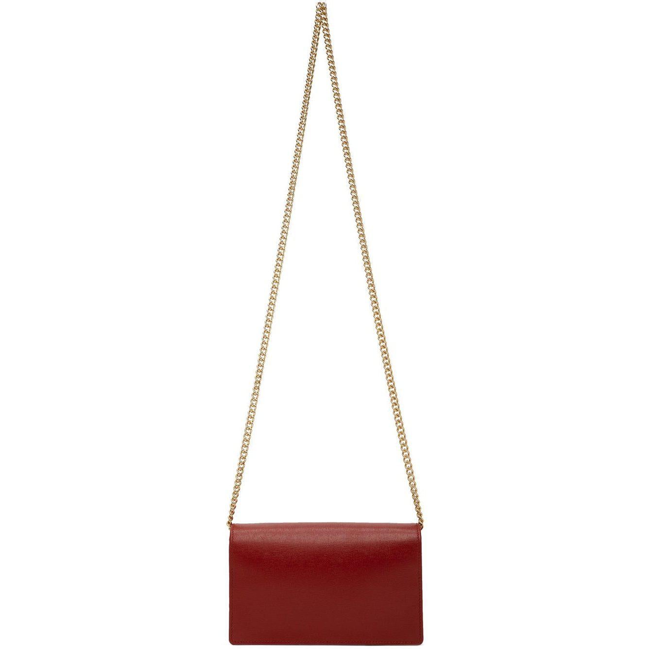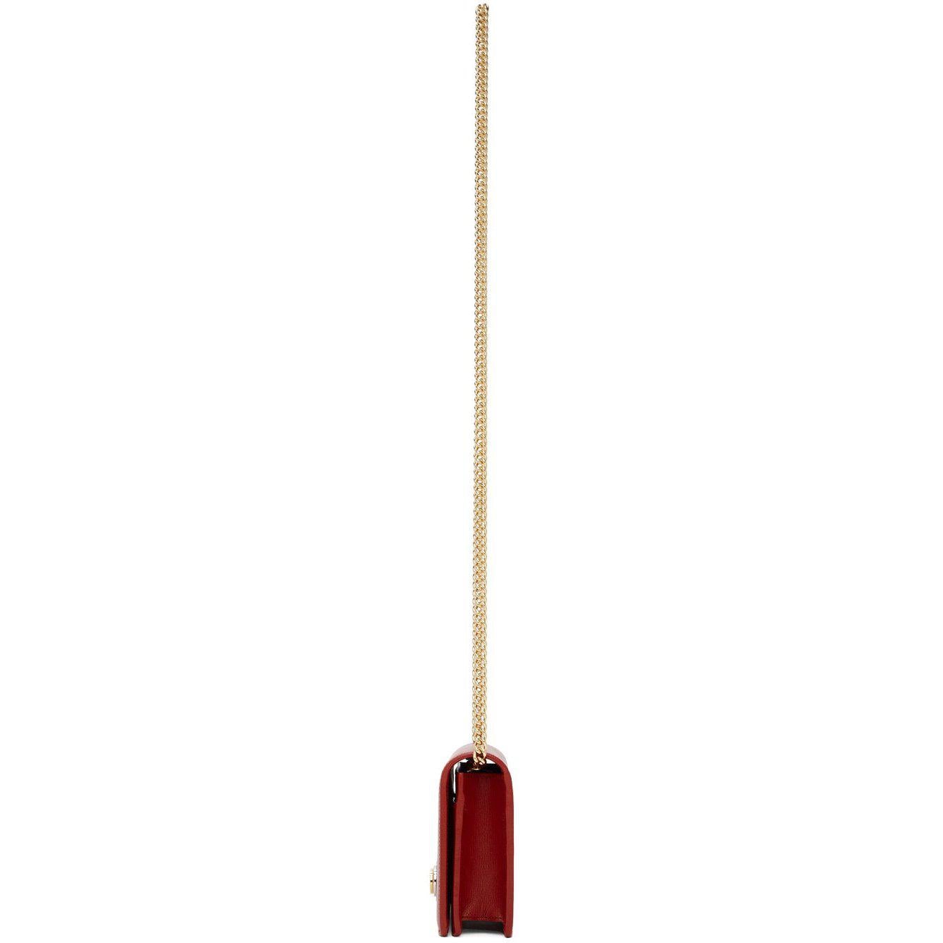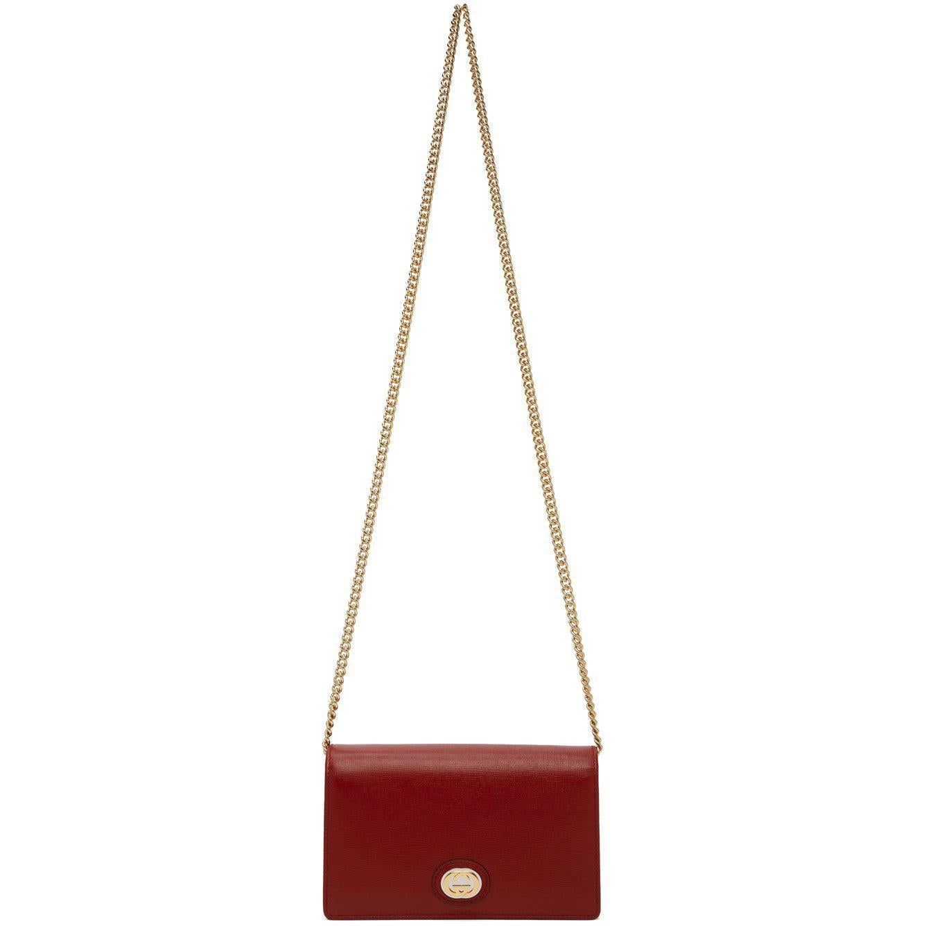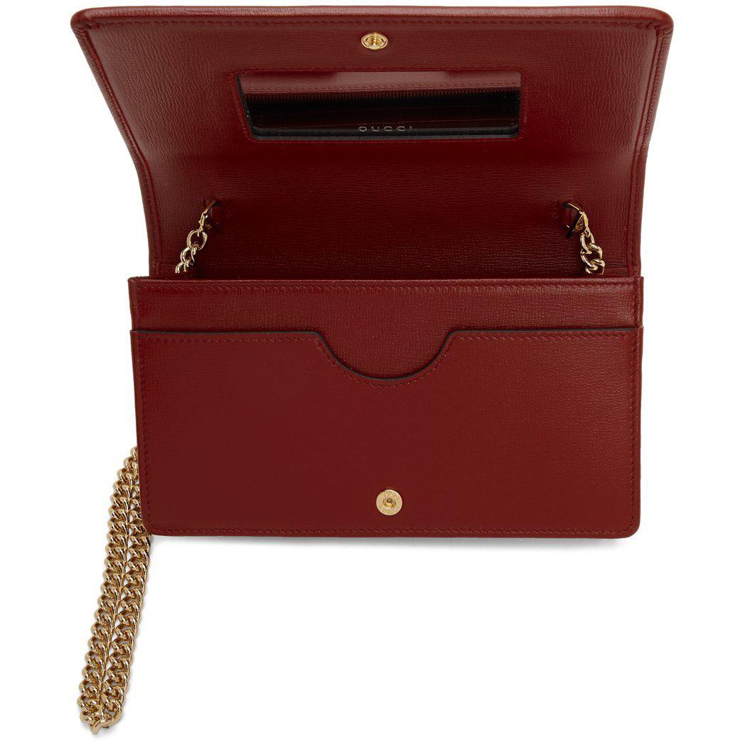 Grained leather shoulder bag in red. Detachable curb chain shoulder strap with toggle fastening. Logo hardware and concealed patch pocket at face. Foldover flap with press-stud fastening. Note slot, four card slots, zippered coin pouch, and logo-engraved mirror at interior. Tonal textile lining. Gold-tone hardware. Approx. 8 length x 5 height x 2 width. Supplier color: Cherry Leather. Brand: Gucci