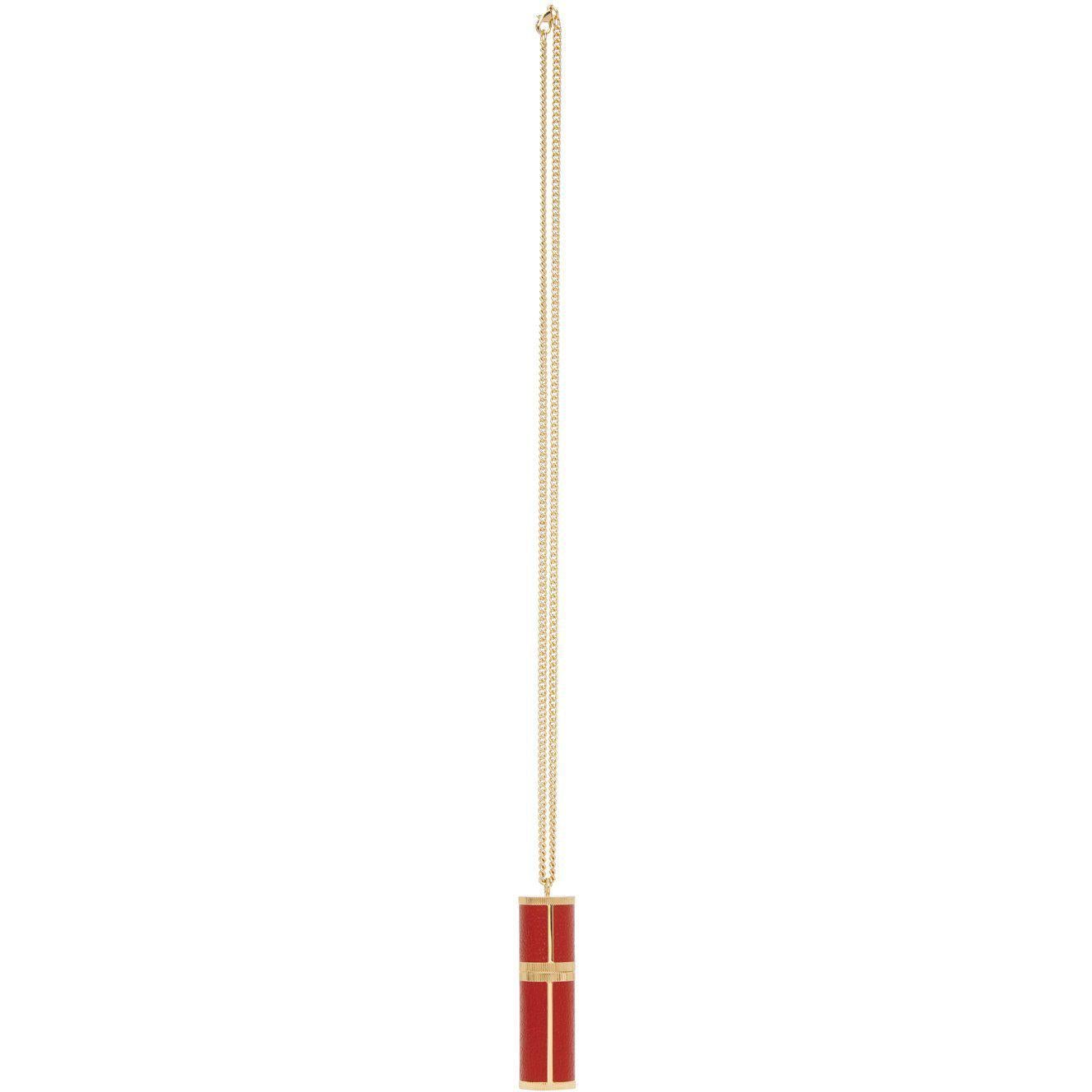 Grained leather-covered metal atomizer in red. Detachable curb chain shoulder strap with lobster clasp fastening. Twist cap fastening. Gold-tone hardware. Approx. 30 length. Supplier color: Red Leather, metal. Brand: Gucci
