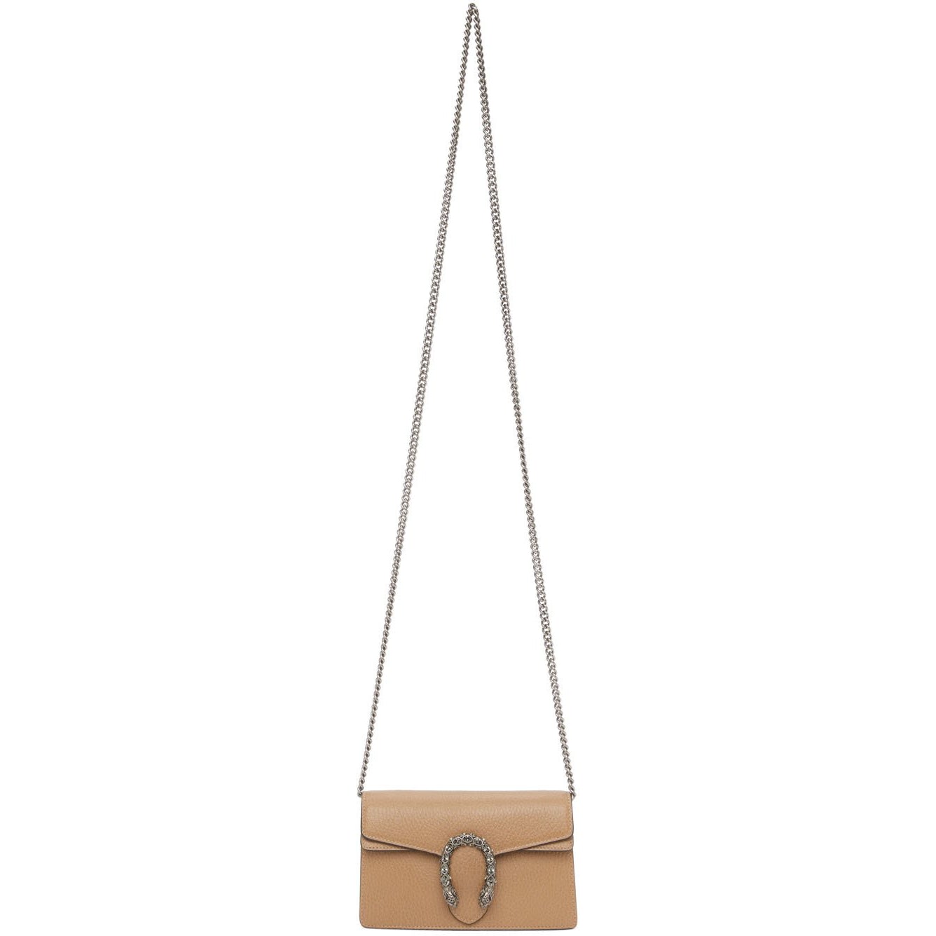 Grained leather shoulder bag in tan. Burnished edges in black throughout. Detachable curb chain shoulder strap with toggle fastening. Signature hardware featuring crystal-cut detailing at face. Foldover flap with press-stud fastening. Detachable lanyard clasp hardware and embossed logo at interior. Tonal faux-suede lining. Antiqued silver-tone hardware. Approx. 6.5 length x 4 height x 1.5 width. Supplier color: Natural tan/Black Leather. Brand: Gucci