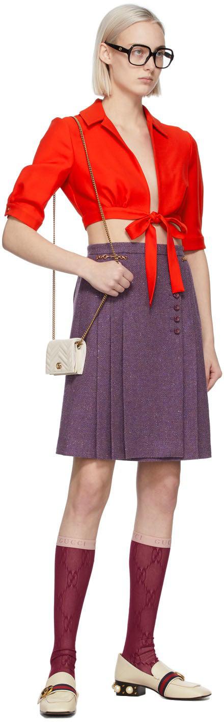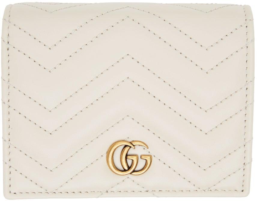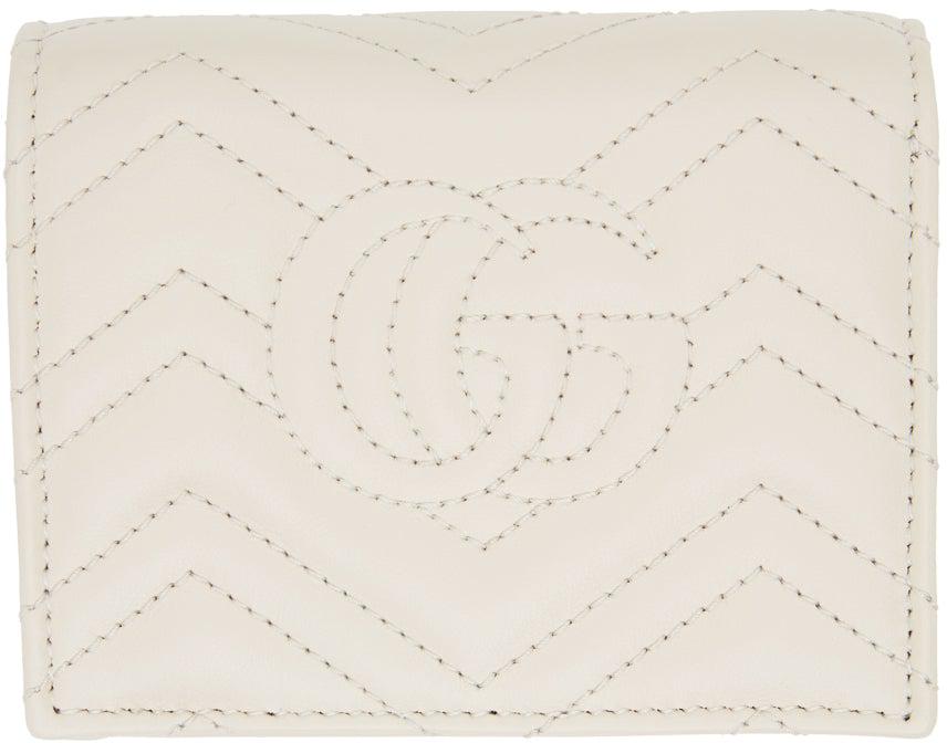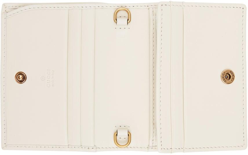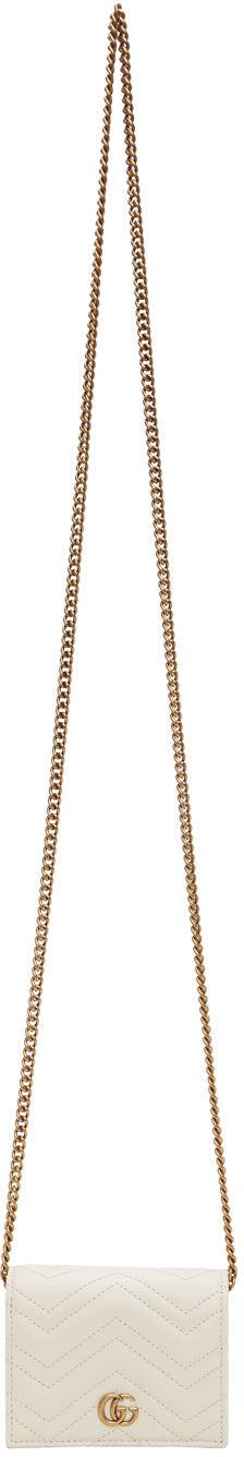 Quilted leather shoulder bag in white. Detachable curb chain shoulder strap with toggle fastening. Logo hardware at face. Quilted graphic at back face. Foldover flap with press-stud fastening. Six note slots and zippered pocket at interior. Tonal leather and textile lining. Antiqued gold-tone hardware. Approx. 4.25 length x 3.5 height x 1 width. Supplier color: White Leather. Brand: Gucci