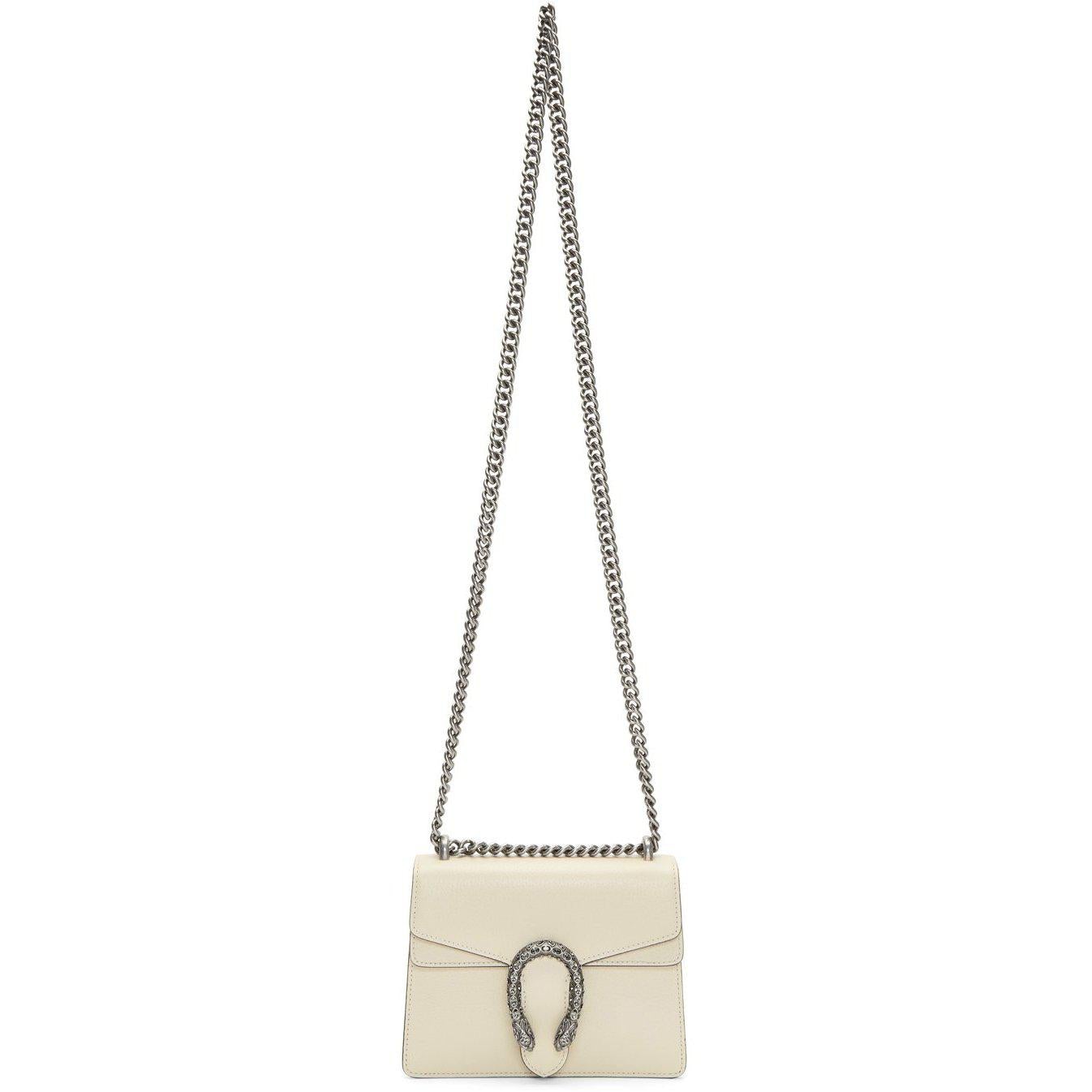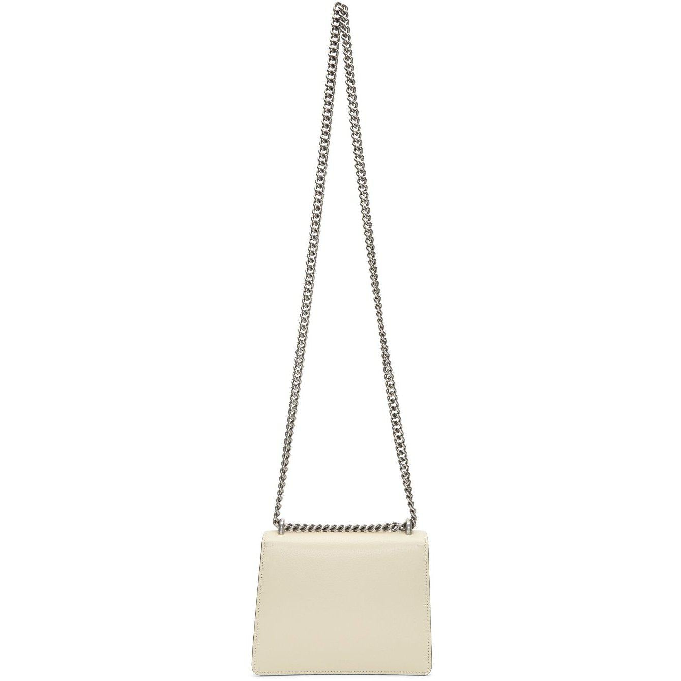 Grained leather shoulder bag in white. Burnished edges in black throughout. Sliding curb chain shoulder strap. Signature hardware featuring crystal-cut detailing and partially concealed flap pocket at face. Foldover flap with press-release fastening. Leather logo patch at interior. Tonal textile lining. Antiqued silver-tone hardware. Approx. 7.5 length x 6 height x 2 width. Supplier color: White Leather. Brand: Gucci