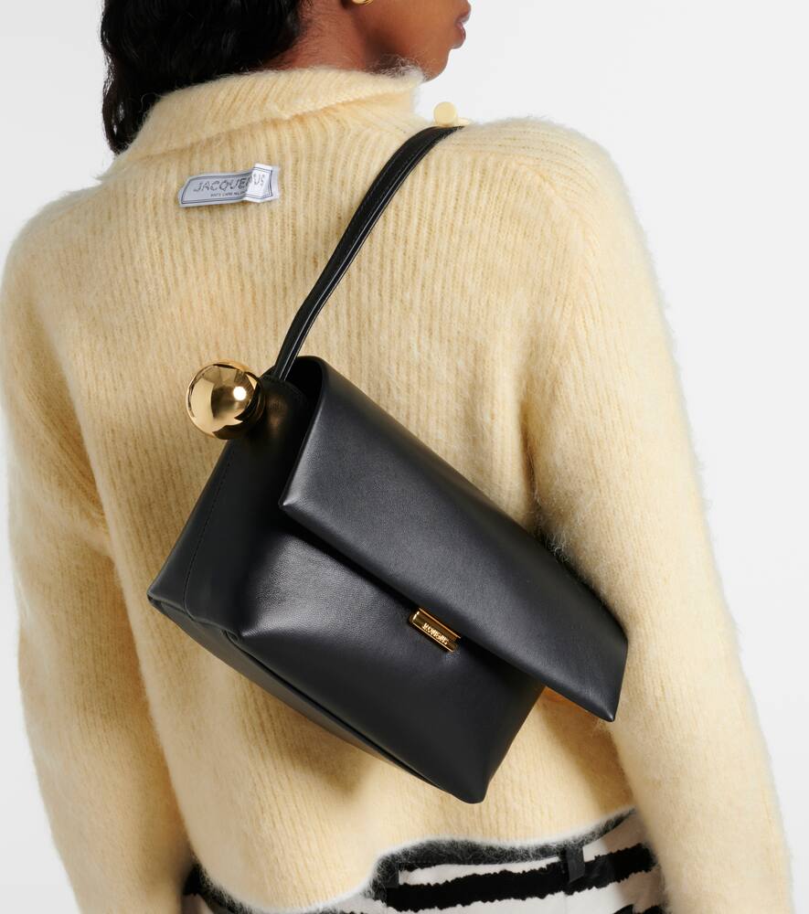 Material: lamb leather. Lining: cotton. Made in Italy. Designer color name: Black. Includes: dust bag. Top handle. Closure: push-lock fastening. Internal details: two internal compartments, card slot, internal zipped pocket. Hardware color: gold. Color of fastening: gold. Back pocket. Shop the latest Jacquemus Shoulder Bags for women now.