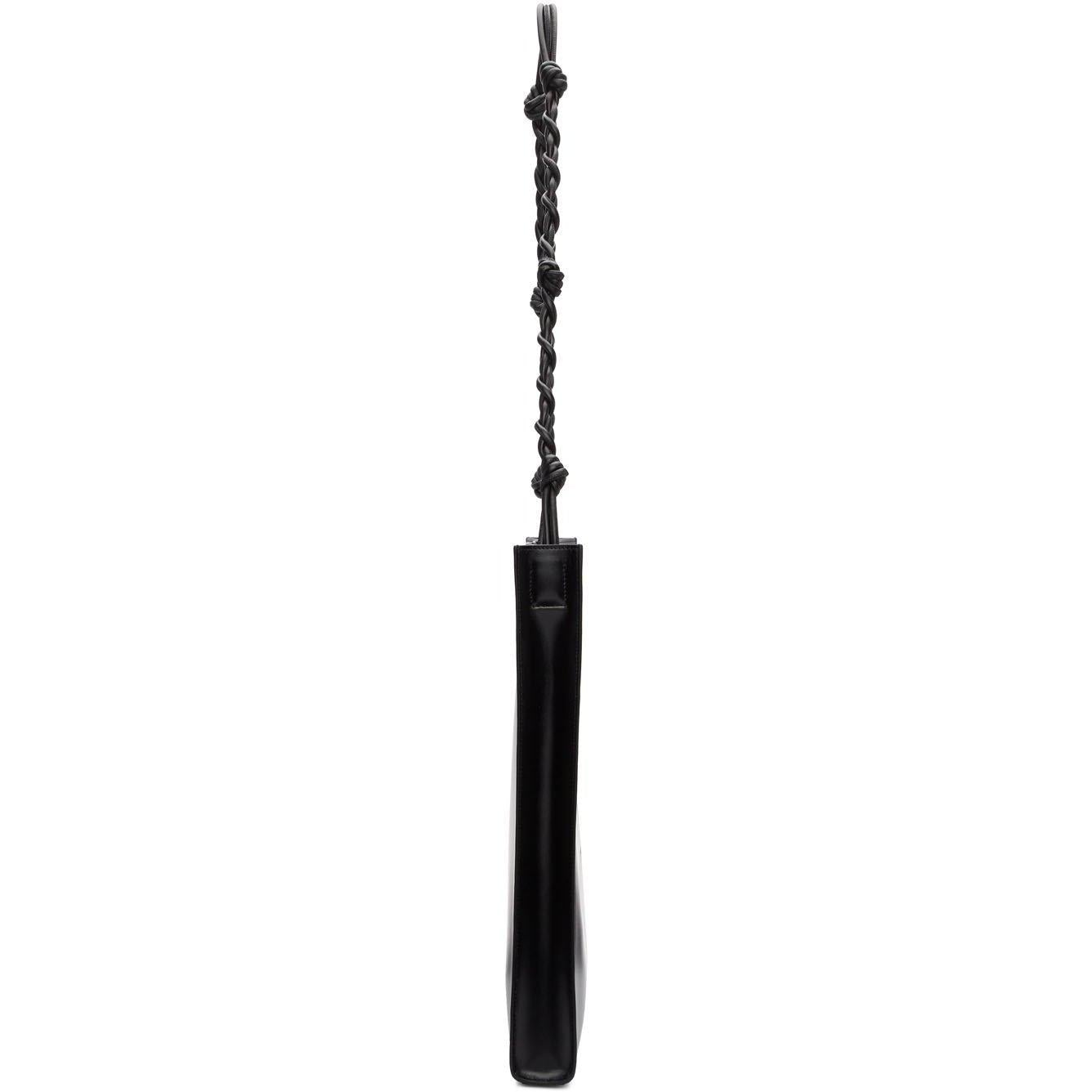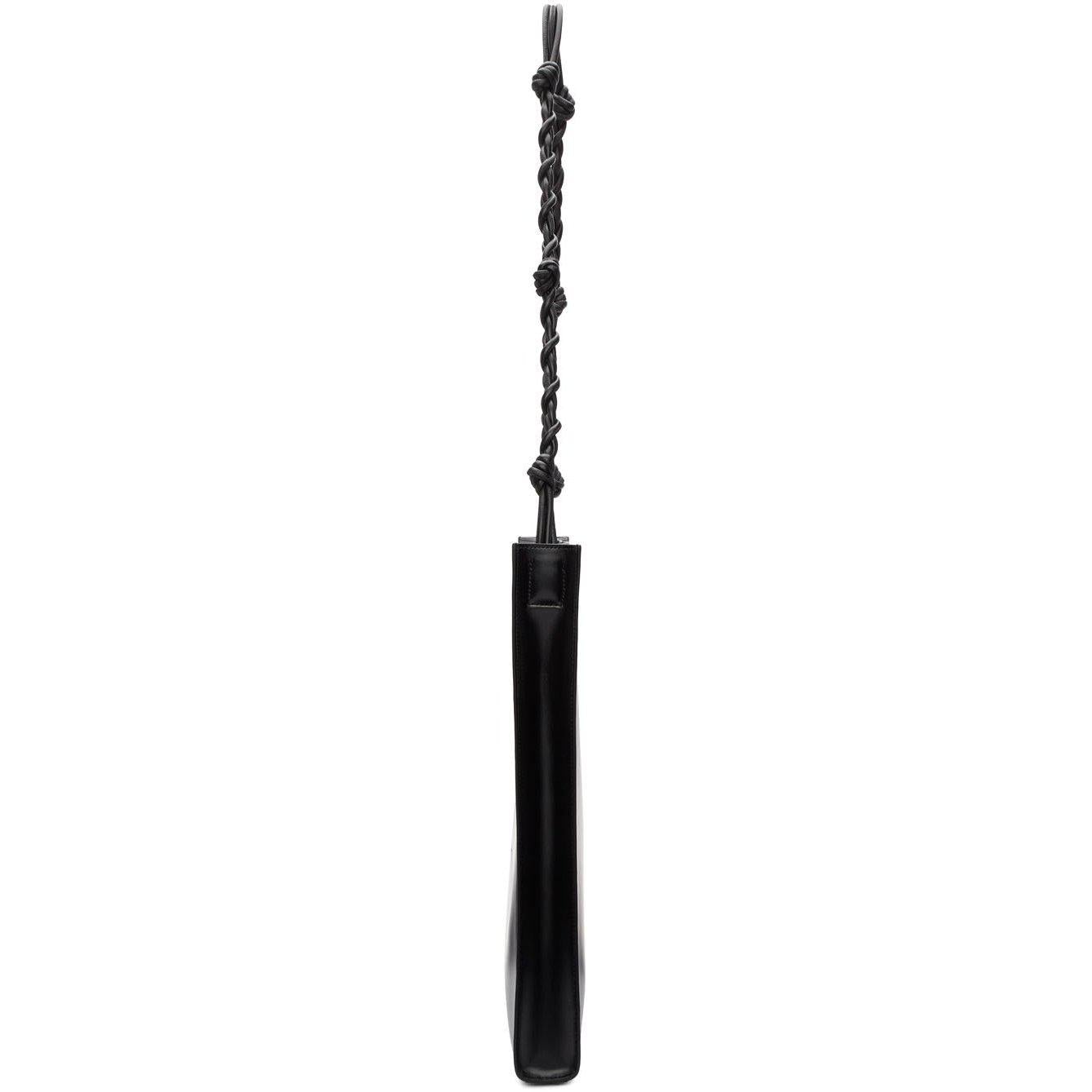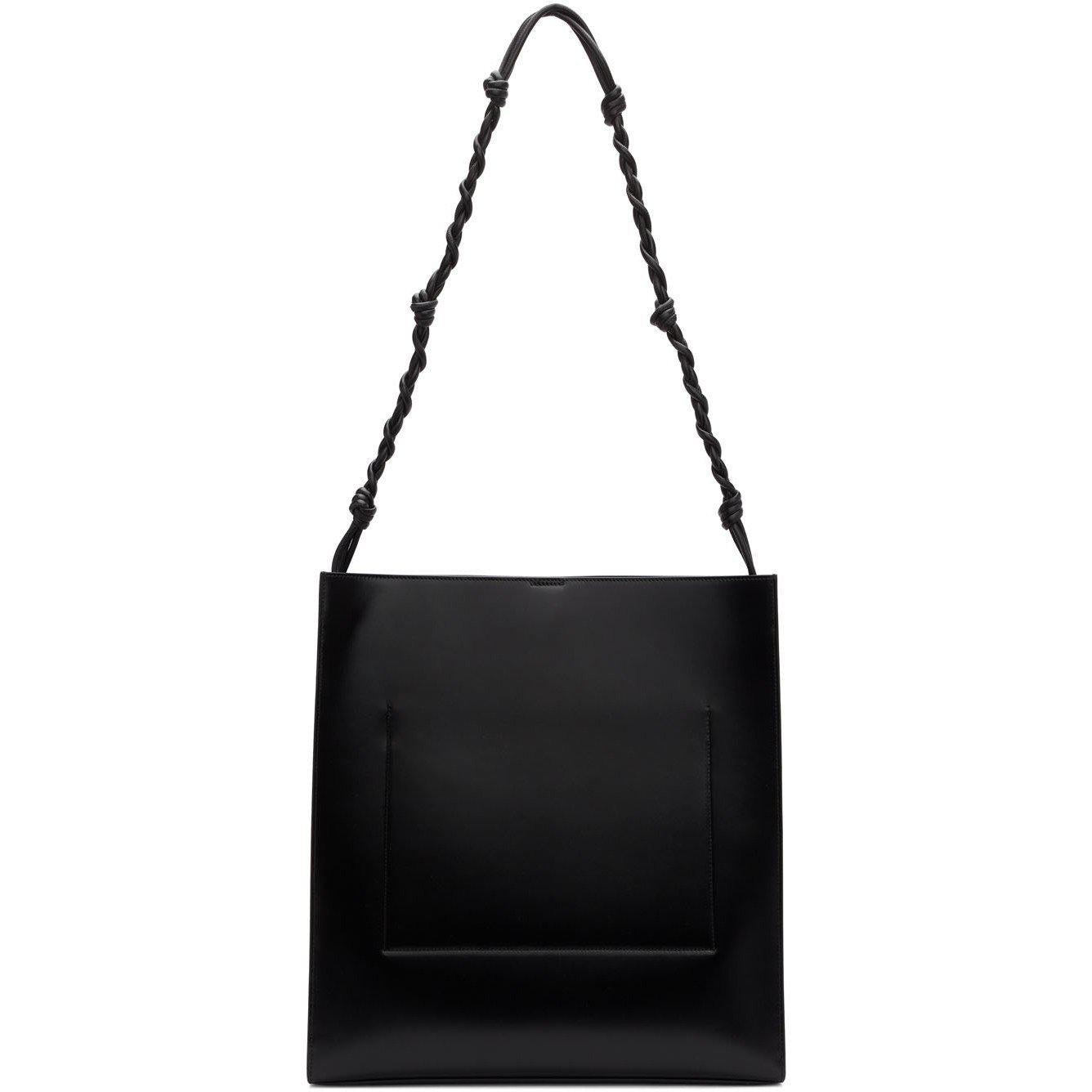 Buffed calfskin shoulder bag in black. Woven leather shoulder strap featuring knot accents. Silver-tone logo stamp at face. Magnetic press-stud fastening at throat. Three patch pockets at interior. Tonal leather lining. Approx. 13.5 length x 14 height x 2 width. Supplier color: Black Calfskin. Brand: Jil Sander