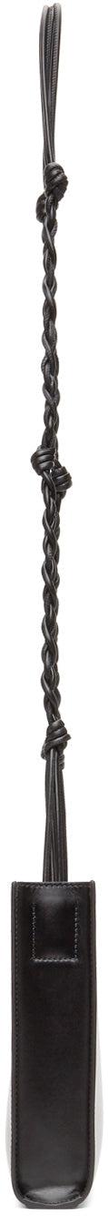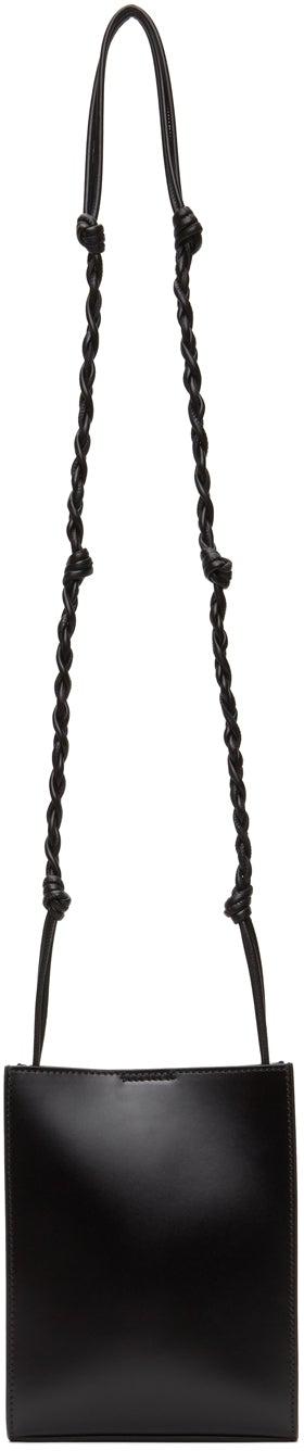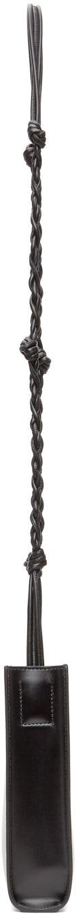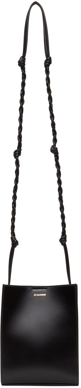 Buffed calfskin shoulder bag in black. Twisted detailing at shoulder strap. Gold-tone logo stamp at face. Magnetic press-stud fastening at throat. Tonal nappa calfskin lining. Approx. 5.25 length x 7 height x 1.75 width. Supplier color: Black Calfskin. Brand: Jil Sander