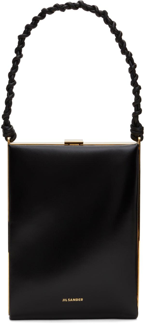 Structured buffed calfskin shoulder bag in black. Gold-tone metal trim throughout. Fixed shoulder strap with knotted accents. Gold-tone logo stamp at face. Flip-clasp fastening. Accordion panels, patch pocket, and logo embossed at interior. Tonal calfskin lining. Gold-tone hardware. Approx. 5.5 length x 7.5 height x 1 width. Supplier color: Black Calfskin, metal. Brand: Jil Sander