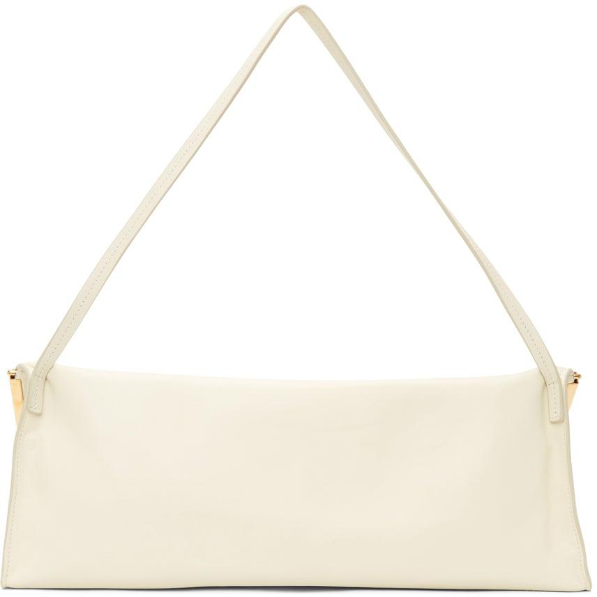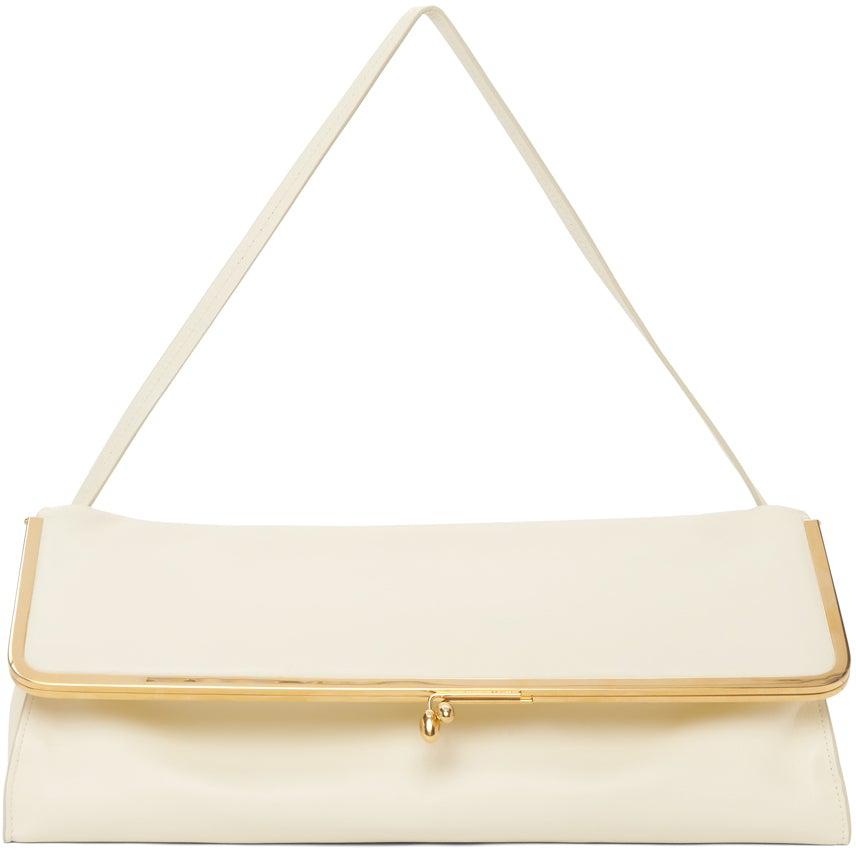 Buffed lambskin shoulder bag in off-white. Fixed shoulder strap. Kiss-lock fastening. Embossed logo and card holder at interior. Tonal buffed lambskin lining. Gold-tone hardware. Approx. 16 length x 6 height x 4.75 width. Supplier color: Yogurt 100% lambskin. Brand: Jil Sander