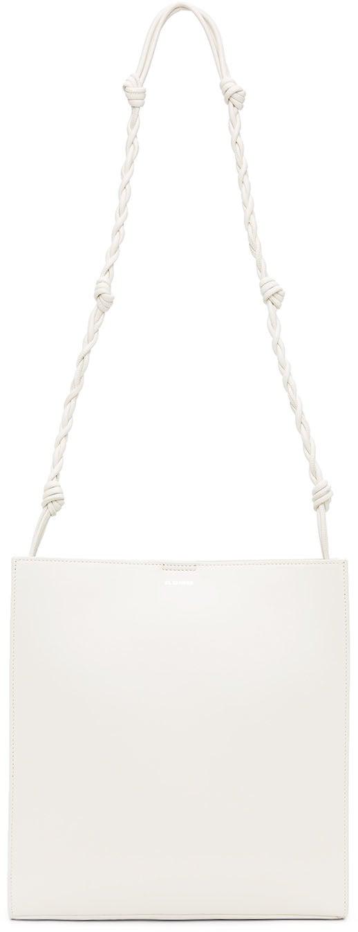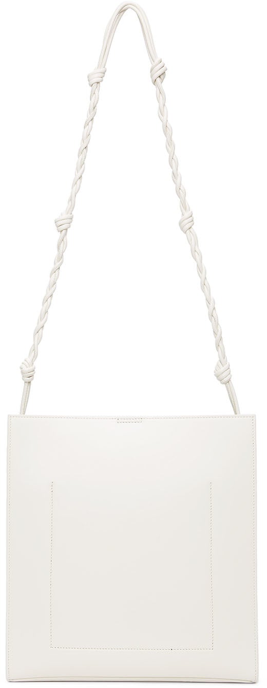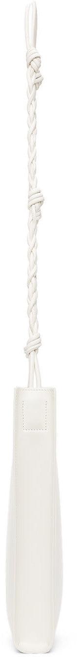 Buffed calfskin shoulder bag in white. Fixed shoulder strap featuring hand-knotted detailing. Silver-tone logo stamp at face. Magnetic press-stud fastening at throat. Embossed logo and patch pockets at interior. Tonal grained leather lining. Approx. 10 length x 10.75 height x 1.75 width. Supplier color: Soft white Calfskin. Brand: Jil Sander