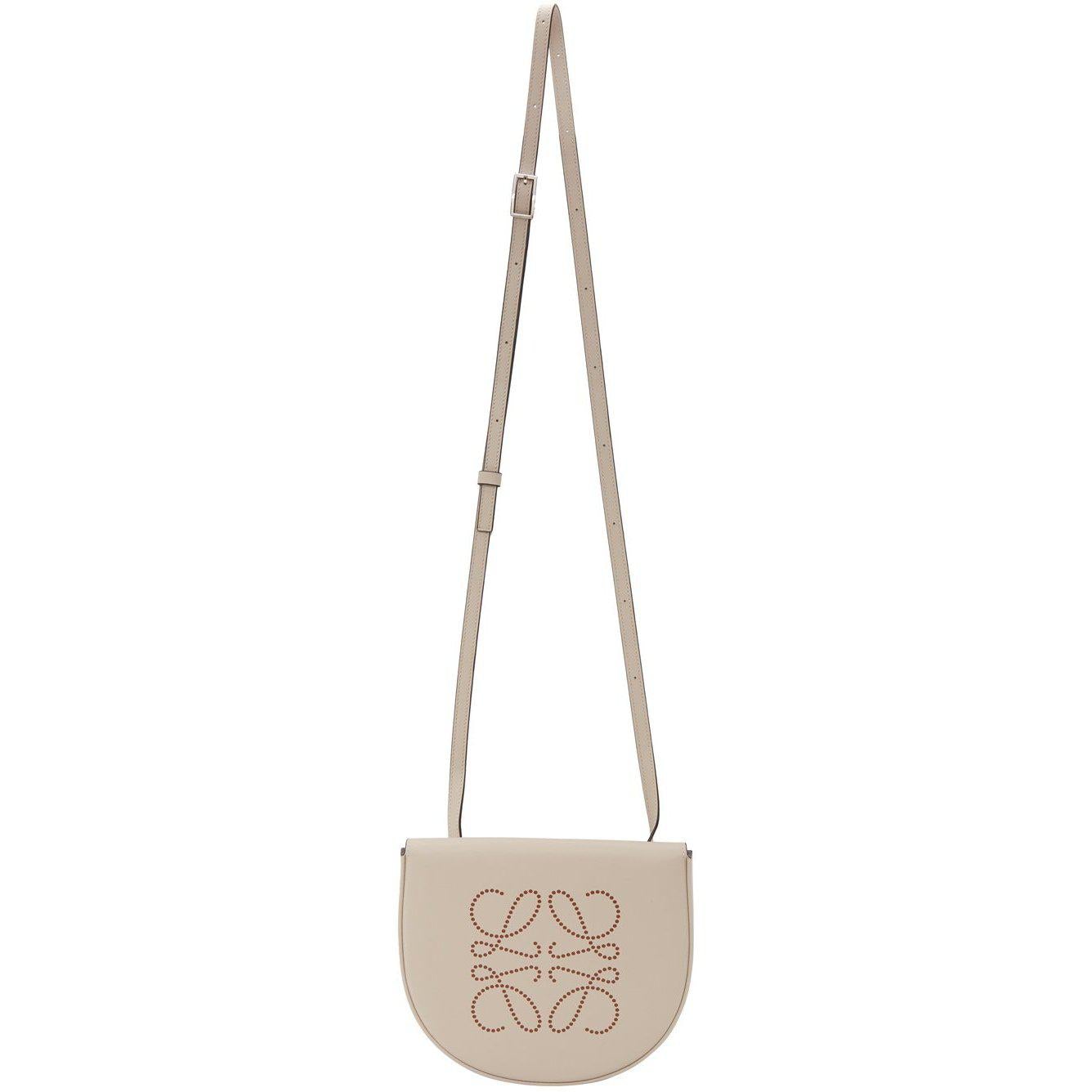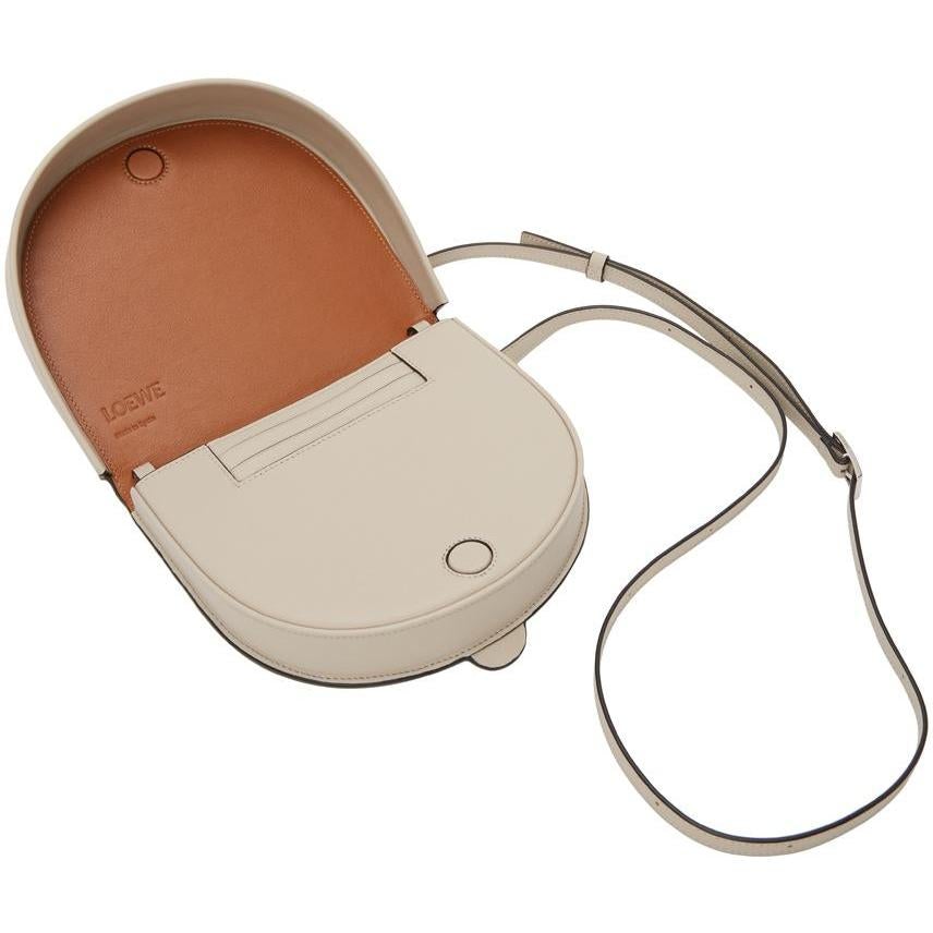 Buffed calfskin shoulder bag in beige. Burnished edges in black throughout. Adjustable shoulder strap with pin-buckle fastening. Perforated anagram at face. Foldover flap with magnetic fastening. Embossed logo, patch pocket, and three card slots at interior. Tonal leather lining. Approx. 7 length x 6 height x 1.5 width. Supplier color: Oat/Tan Calfskin. Brand: Loewe