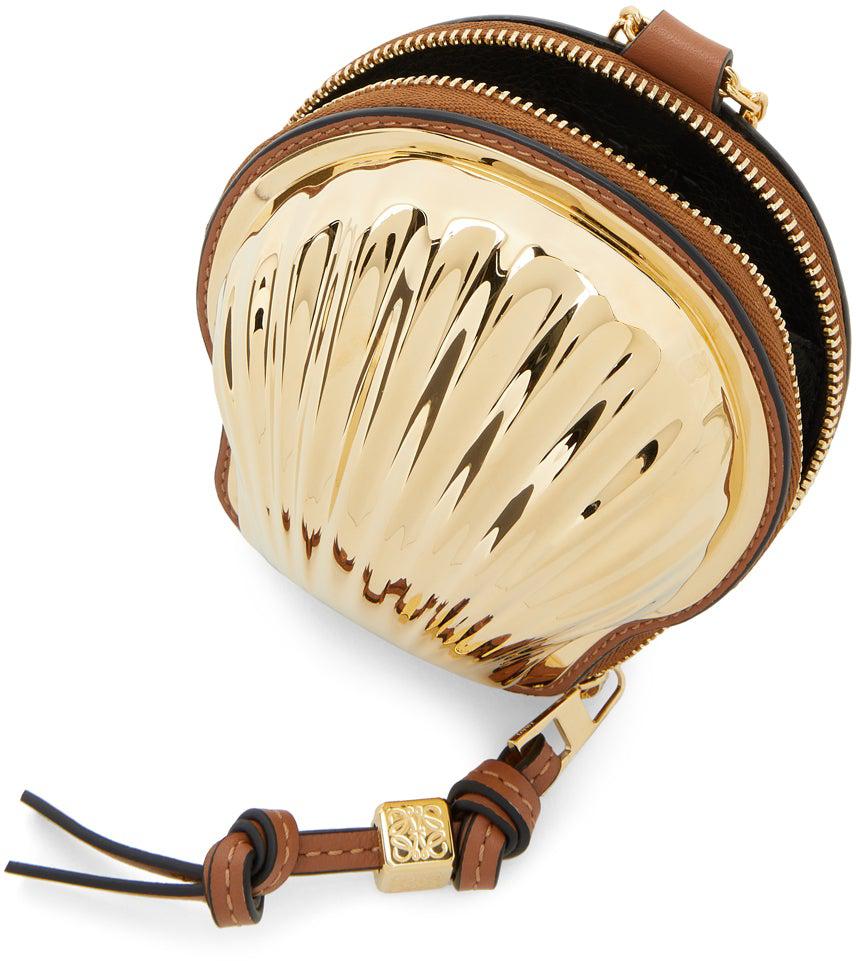 Structured shoulder bag in gold-tone metal and brown buffed calfskin. Burnished edges in black throughout. Fixed chain link shoulder strap. Textured detailing at face. Logo embossed at back face. Logo-embossed calfskin pull-tab featuring knotted accent and logo hardware at zip closure. Expansion panels and embossed logo at interior. Buffed calfskin lining in black. Logo-engraved gold-tone hardware. Approx. 4 length x 4 height x 2 width. Part of the Loewe Paula's Ibiza capsule collection. Supplier color: Gold Calfskin, metal. Brand: Loewe