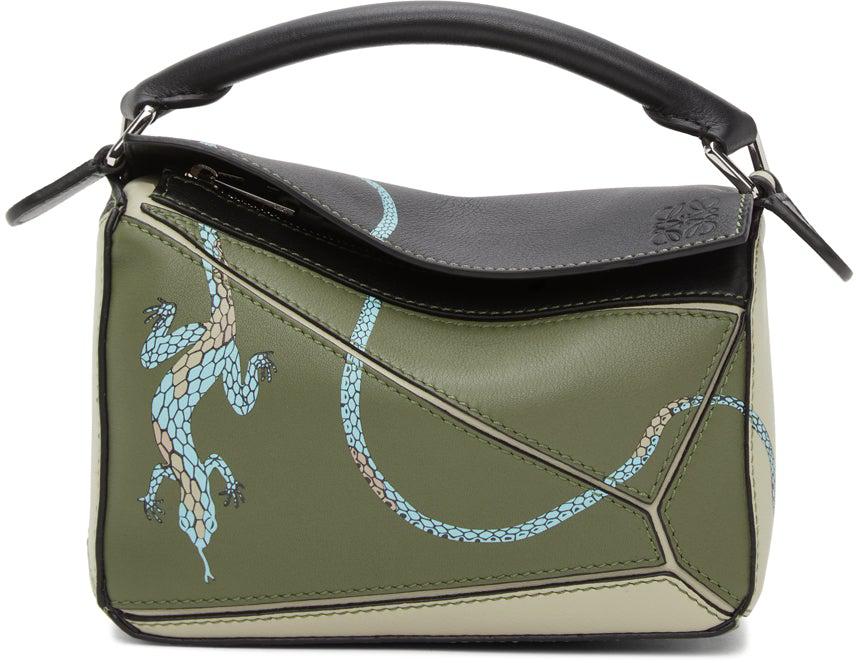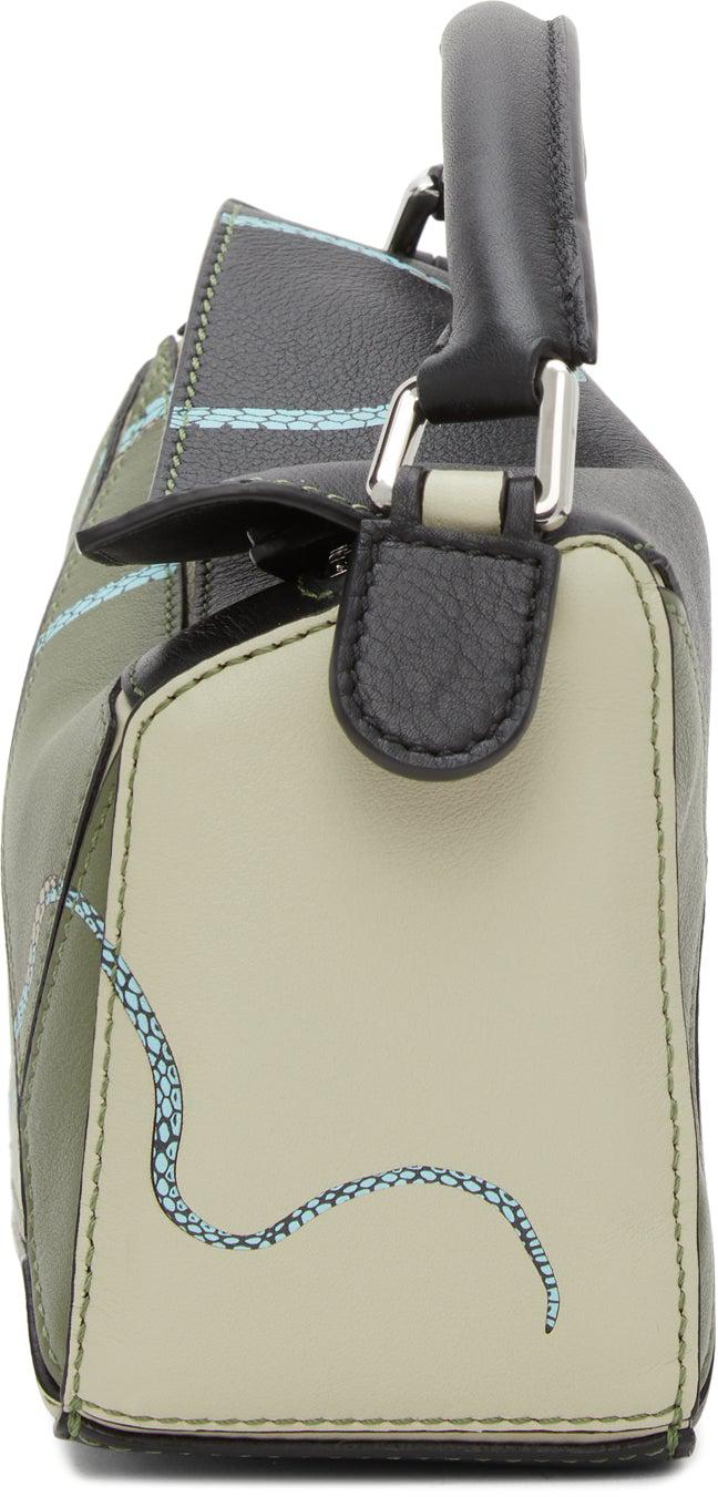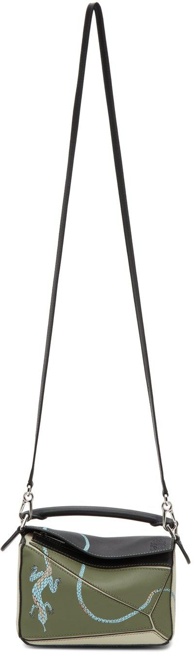 Paneled buffed calfskin shoulder bag colorblocked in tones of green and black. Rolled carry handle at top. Detachable shoulder strap with lanyard clasp fastening. Graphic printed in blue, beige, and black at face. Logo embossed at foldover flap. Zip closure. Logo patch at interior. Herringbone cotton canvas lining in beige. Silver-tone hardware. Approx. 7 length x 4.5 height x 3 width. Part of the Loewe Paula's Ibiza capsule collection. Supplier color: Avocado green/black Calfskin. Brand: Loewe