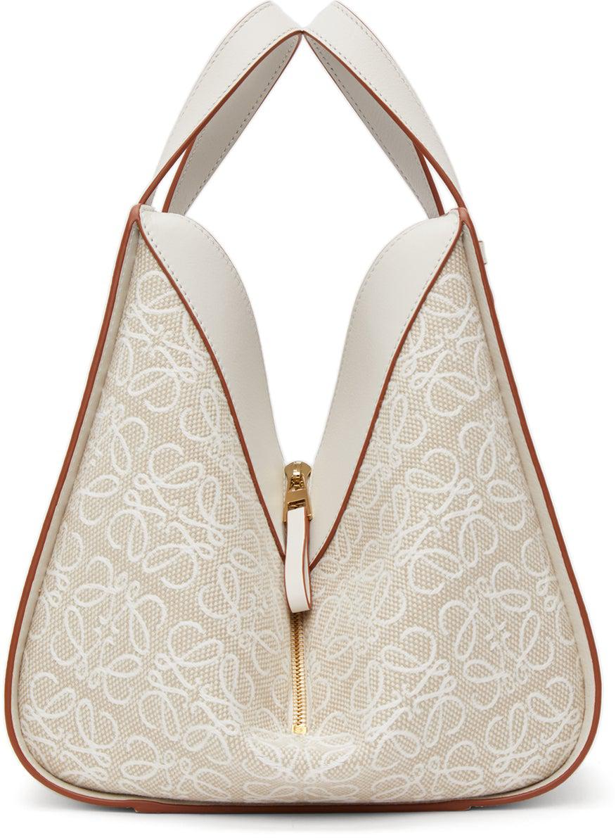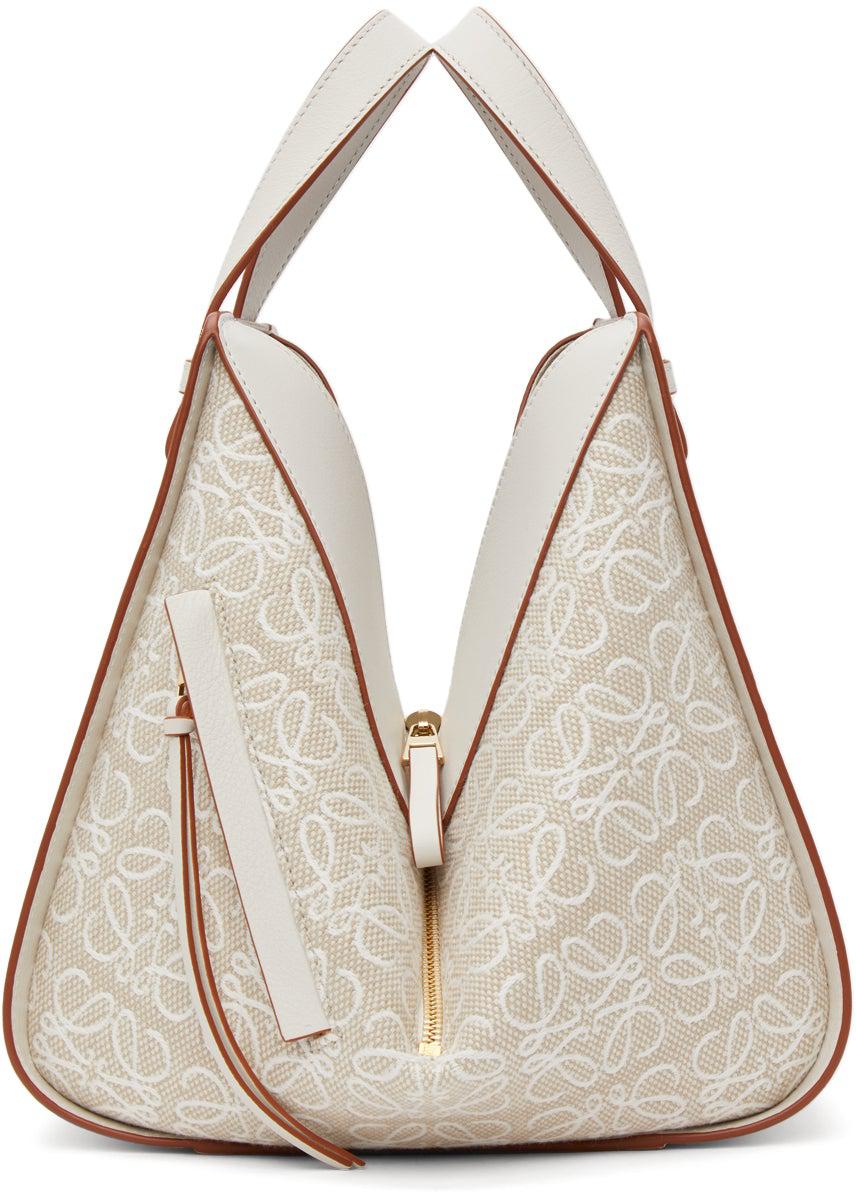 Paneled buffed calfskin and canvas shoulder bag in off-white featuring jacquard logo pattern woven in white and beige. Burnished edges in tan throughout. Twin carry handles at top. Adjustable and detachable shoulder strap with post-stud fastening. Zippered expansion panel at front and back face for alternate styling. Zippered pocket at face. Logo embossed at side. D-ring hardware, lanyard clasp hardware, patch pocket, and logo embossed at interior. Herringbone lining in beige. Logo-engraved gold-tone hardware. Approx. 11.5 length x 9.5 height x 5.5 width. Supplier color: Ecru/Soft white Calfskin, textile. Brand: Loewe