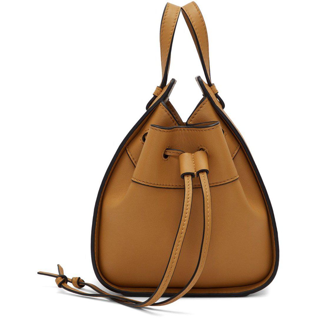 Buffed calfskin shoulder bag in tan. Hand-painted edges in black throughout. Twin carry handles at top. Adjustable and detachable shoulder strap with post-stud fastening. Logo embossed at face. Drawstring fastening at throat. Embossed logo and two patch pockets at interior. Herringbone lining in beige. Gold-tone hardware. Approx. 4 length x 8 height x 6 width. Supplier color: Light caramel Calfskin. Brand: Loewe