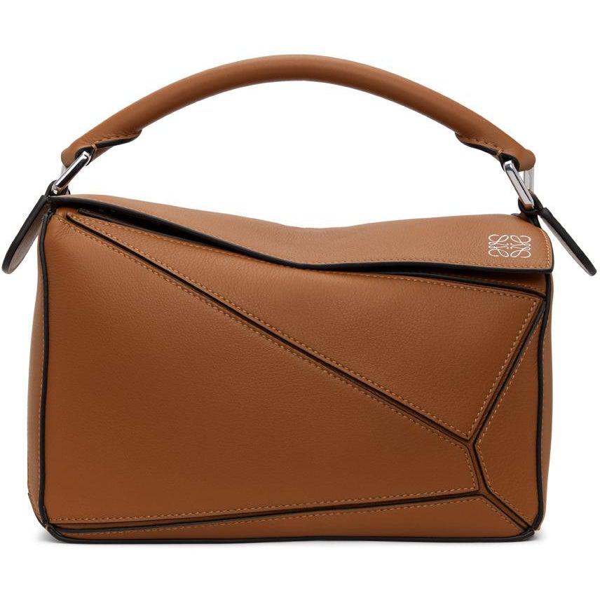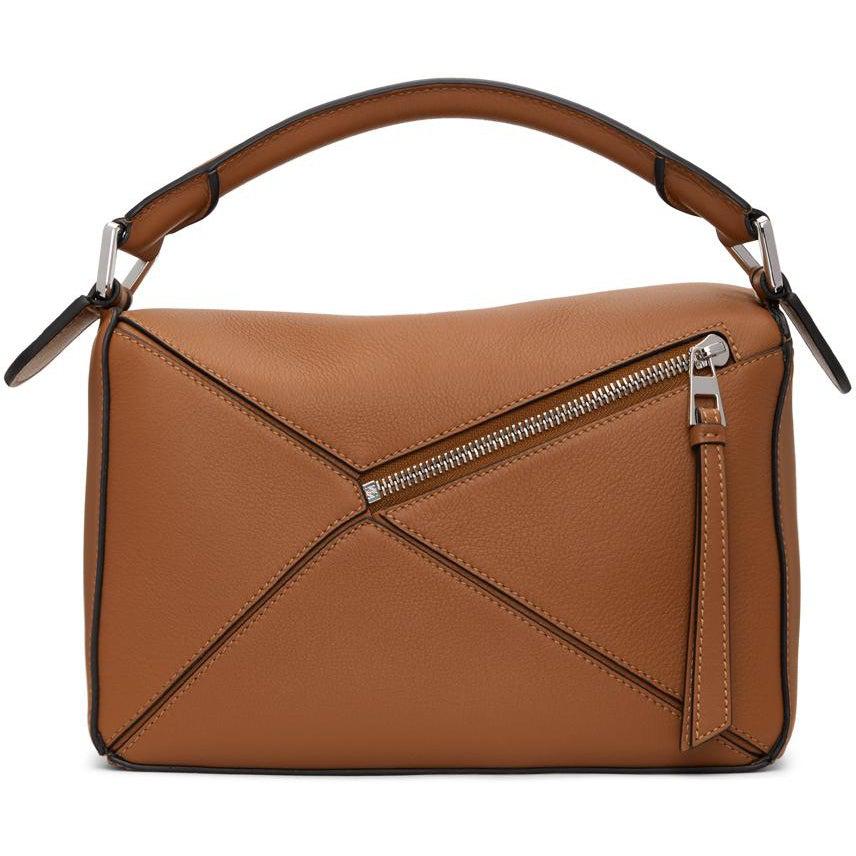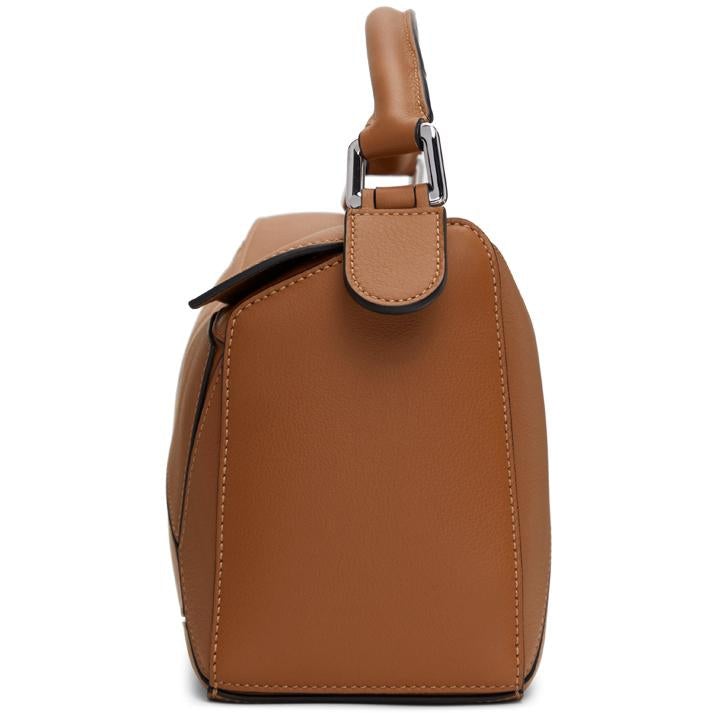 Panelled grained calfskin shoulder bag in tan. Hand-painted edges in black and tonal buffed leather trim throughout. Rolled carry handle at top. Adjustable and detachable shoulder strap featuring lanyard clasp fastening. Embossed logo in white at top. Zippered pocket at back face. Concealed zip closure. Patch pocket and leather logo patch at interior. Textile lining in off-white. Logo-engraved silver-tone hardware. Approx. 9.5 length x 6.25 height x 4 width. Supplier color: Tan Calfskin. Brand: Loewe