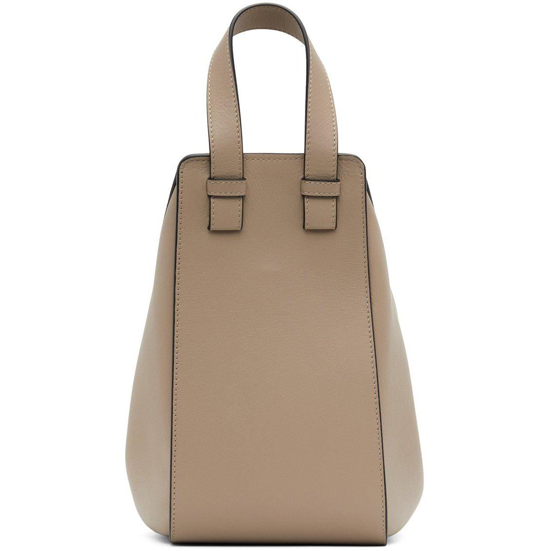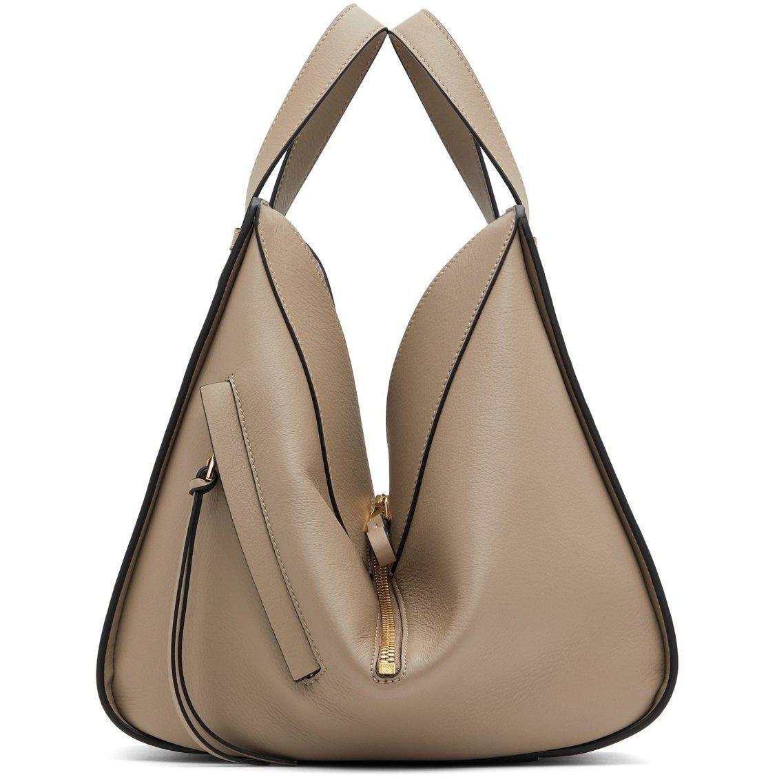 Grained calfskin shoulder bag in taupe. Burnished edges in black throughout. Twin carry handles at top. Detachable and adjustable shoulder strap with post-stud fastening. Zippered expansion panel at front and back faces. Zippered pocket at face. Embossed logo at side. Two patch pockets, D-ring hardware, integrated lanyard clasp fastening, and embossed logo at interior. Textile lining in beige. Gold-tone hardware. Approx. 11.5 length x 10 height x 5 width. Supplier color: Sand Calfskin. Brand: Loewe