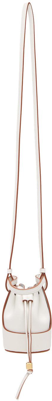 Buffed calfskin shoulder bag in white. Burnished edges in tan throughout. Fixed shoulder strap. Carry handle at top. Logo embossed at side and base. Drawstring at throat with logo hardware and cord lock fastening. Logo embossed at interior. Tonal suede lining. Gold-tone hardware. Approx. 4 length x 5.5 height x 3 width. Supplier color: Soft white Calfskin. Brand: Loewe