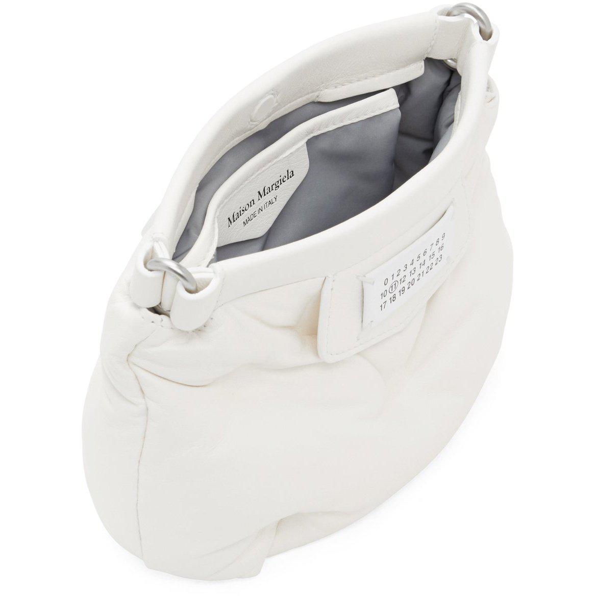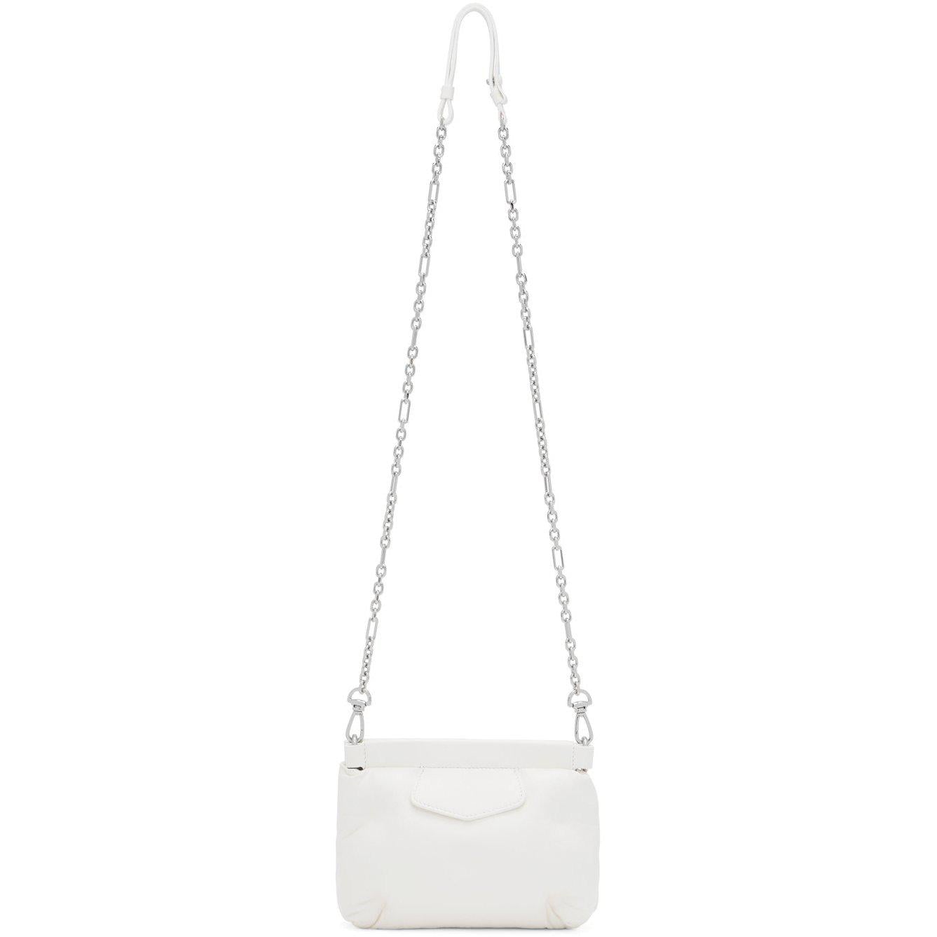 Buffed leather shoulder bag in white. Detachable and adjustable chain link shoulder strap with leather strap pad and carabiner fastening. Leather logo appliqué with signature white stitching at face. Magnetic closure at throat. Patch pocket and leather logo patch at interior. Textile lining in grey. Silver-tone hardware. Approx. 9 length x 6 height x 2 width. Supplier color: White Leather. Brand: Maison Margiela