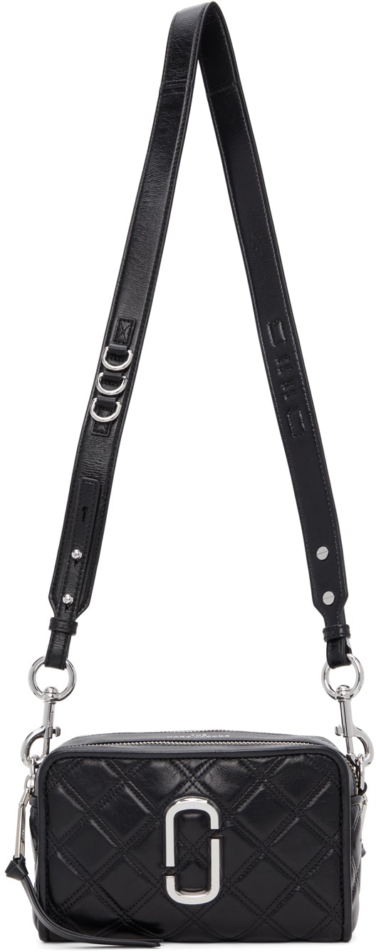 Quilted grained lambskin twin-compartment shoulder bag in black. Detachable and adjustable shoulder strap featuring D-ring hardware, post-stud fastening, and lobster clasp fastening. Silver-tone logo stamp at top. Logo plaque at face. Patch pocket at back face. Twin zip closures. Embossed logo patch and three card slots at interior. Tonal textile lining. Silver-tone hardware. Approx. 8.25 length x 5.25 height x 3.25 width. Supplier color: Black Lambskin. Brand: Marc Jacobs