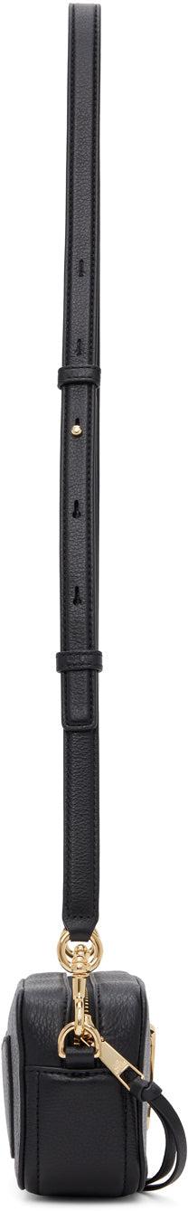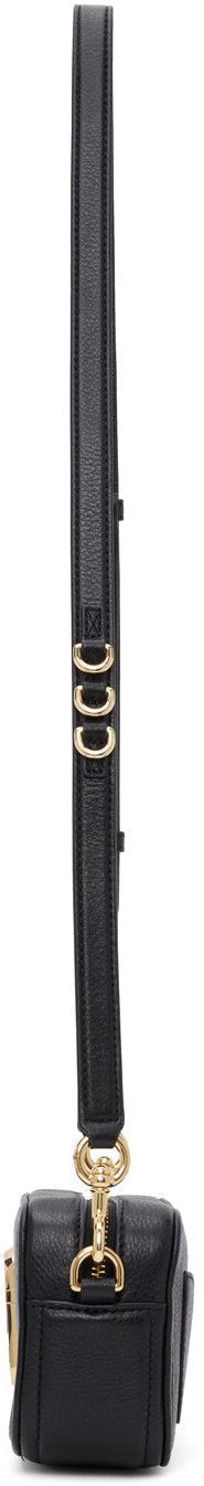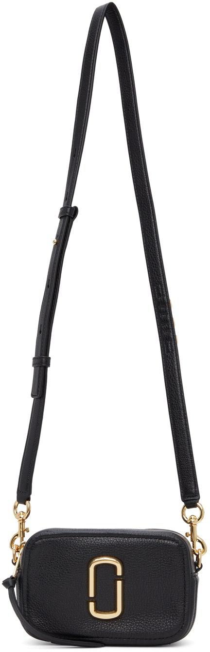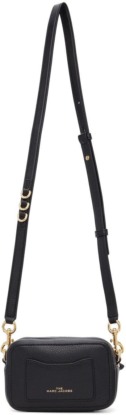 Grained leather shoulder bag in black. Detachable and adjustable shoulder strap featuring D-ring hardware, post-stud fastening, and lobster clasp fastening. Logo plaque at face. Patch pocket with gold-tone logo stamp at back face. Zip closure. Tonal leather logo patch and card slot at interior. Tonal textile lining. Gold-tone hardware. Approx. 6.5 length x 4.25 height x 2.5 width. Supplier color: Black Leather. Brand: Marc Jacobs