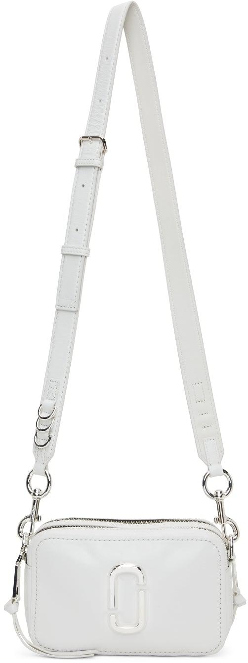 Grained leather two-compartment shoulder bag in white. Logo hardware at face. Detachable shoulder strap with lobster clasp fastening. Zip closure at main compartments. Three card slots at interior. Woven textile lining in off-white. Silver-tone hardware. Approx. 8 length x 5 height x 3.25 width. Supplier color: White Leather. Brand: Marc Jacobs
