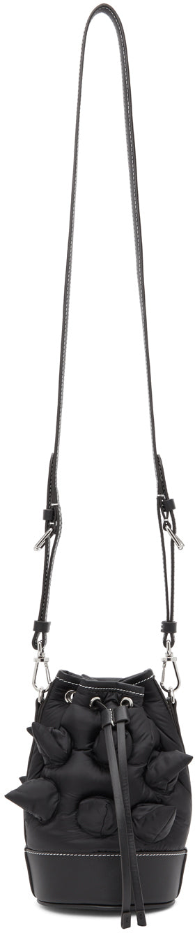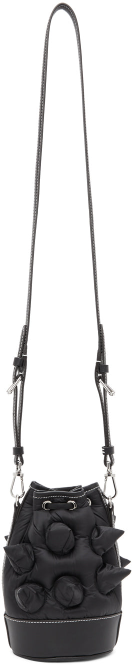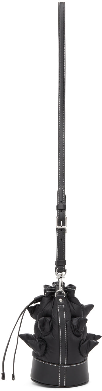 Down-filled leather and nylon shoulder bag in black. Contrast stitching in white throughout. Adjustable and detachable shoulder strap with lanyard clasp fastening. Logo embossed at base. Drawstring fastening at throat. Tonal textile lining. Silver-tone hardware. Approx. 8 length x 8.5 height x 4 width. Part of 1 Moncler JW Anderson collection. Supplier color: Black Fill: 90% goose down, 10% feathers. Leather, texile. Brand: Moncler Genius