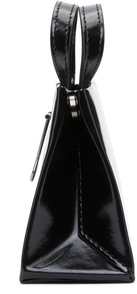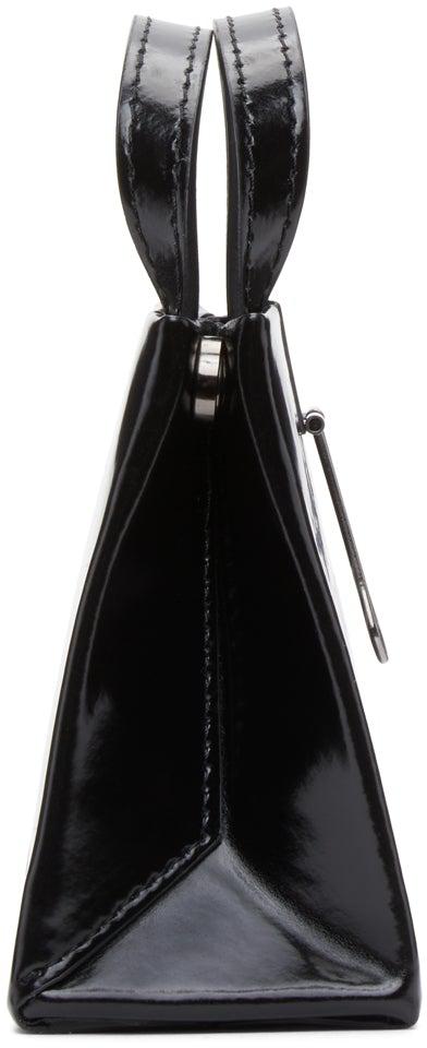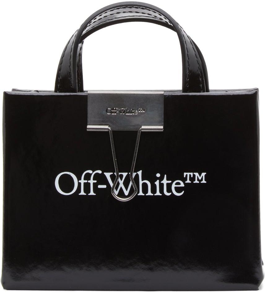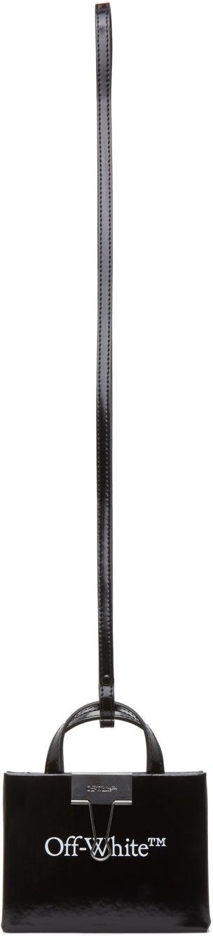 Structured patent leather shoulder bag in black. Twin carry handles at top. Detachable shoulder strap with press-stud fastening at top. Logo printed in white at front and back faces. Press-stud fastening at sides. Signature binder clip hardware and logo graphic printed in white at interior. Tonal textile lining. Gunmetal-tone hardware. Approx. 5.25 length x 4 height x 2.25 width. Supplier color: Black Leather, textile. Brand: Off-White