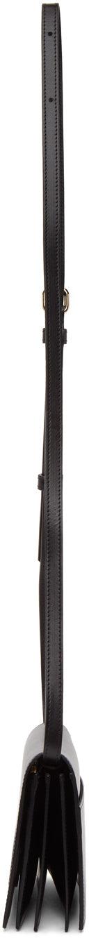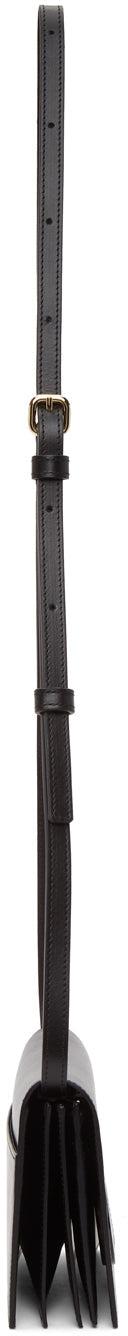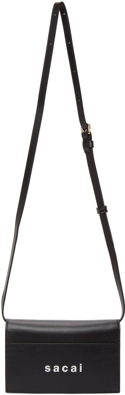 Buffed leather shoulder bag in black. Detachable and adjustable sliding leather shoulder strap with pin-buckle fastening. Logo printed in white and patch pocket at face. Cut-out detailing and logo-embossed hardware at back face. Accordion panel at sides. Foldover flap with press-stud fastening. Embossed logo, zippered pocket, four note slots, and eight card slots at interior. Tonal textile lining. Tonal and gold-tone hardware. Approx. 7.75 length x 5 height x 1.25 width. Supplier color: Black Leather. Brand: Sacai