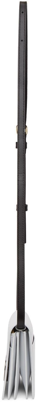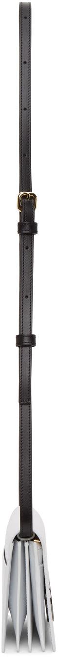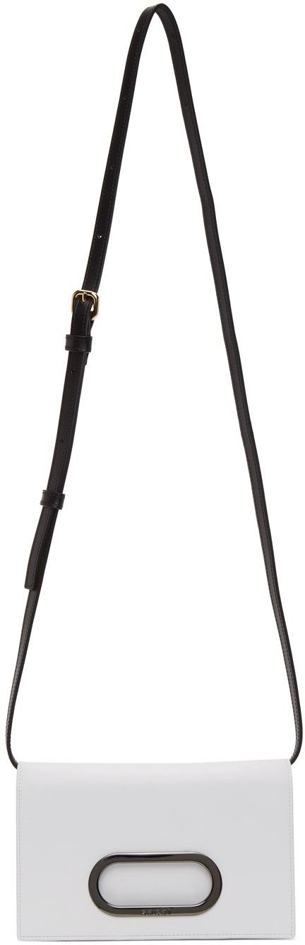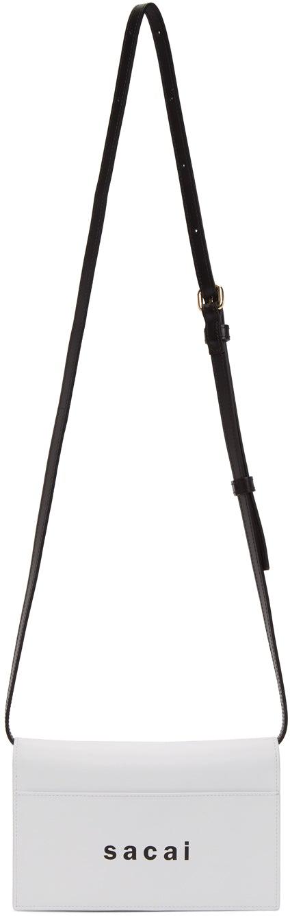 Buffed leather shoulder bag in white. Detachable and adjustable sliding leather shoulder strap in black with pin-buckle fastening. Logo printed in black and patch pocket at face. Cut-out detailing and logo-embossed hardware in gunmetal-tone at back face. Accordion panel at sides. Foldover flap with press-stud fastening. Embossed logo, zippered pocket, four note slots, and eight card slots at interior. Tonal textile lining. Gold-tone hardware. Approx. 7.75 length x 5 height x 1.25 width. Supplier color: White Leather. Brand: Sacai